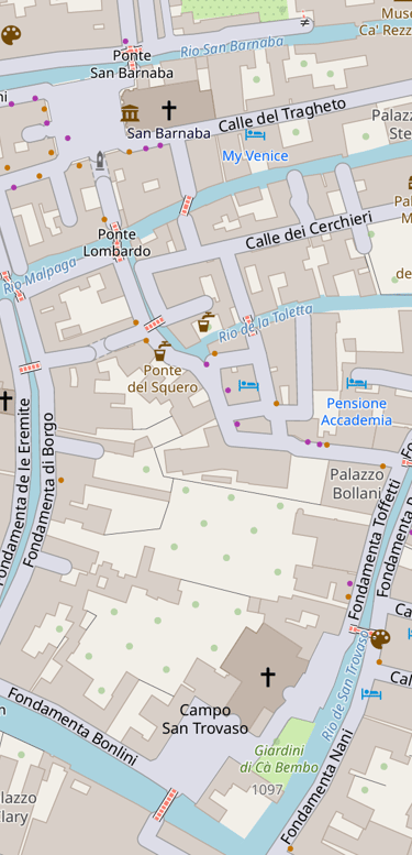 Yes, we join the rio of San Trovaso on the left and we'll stop at Campo San Trovaso..