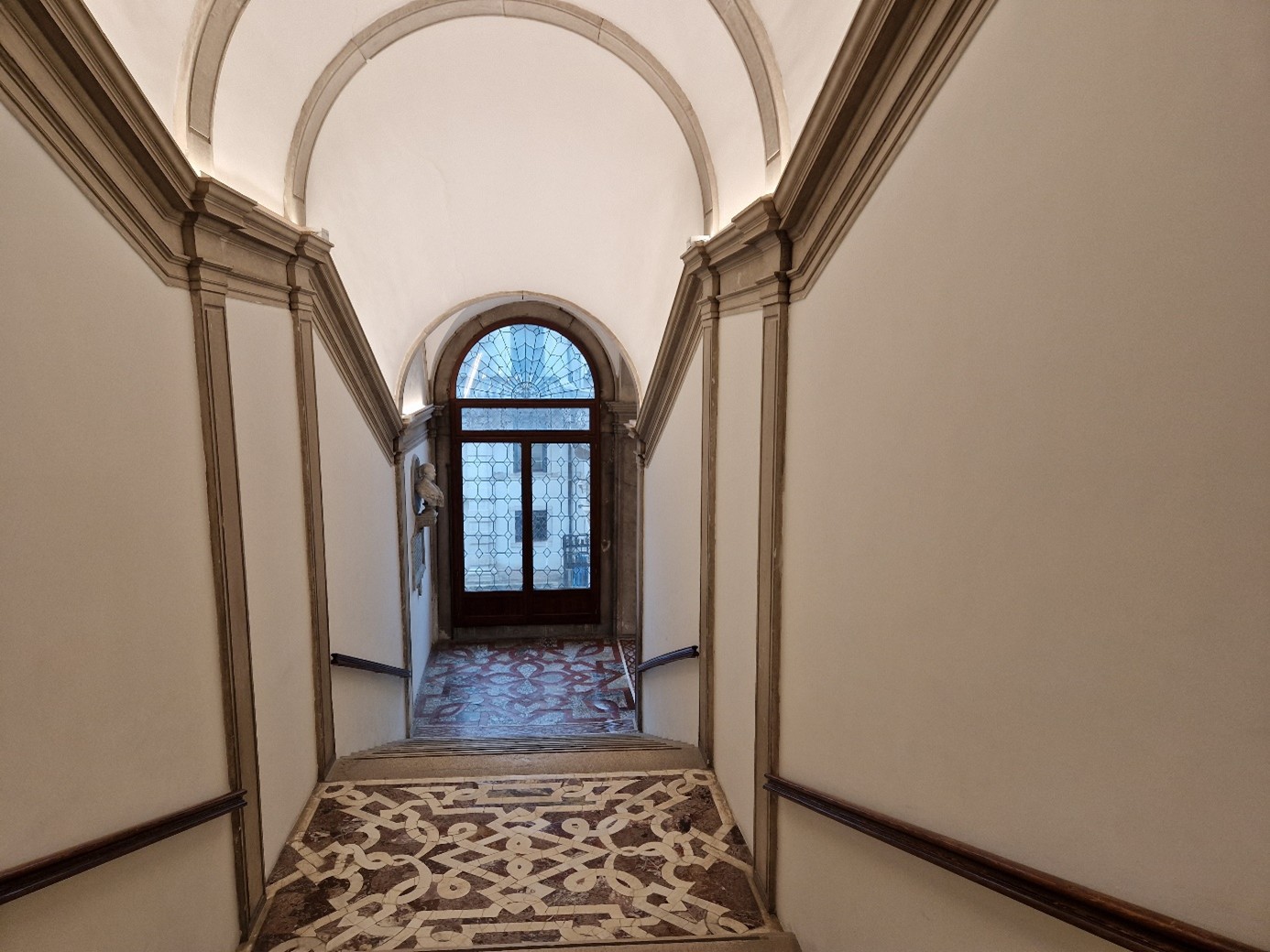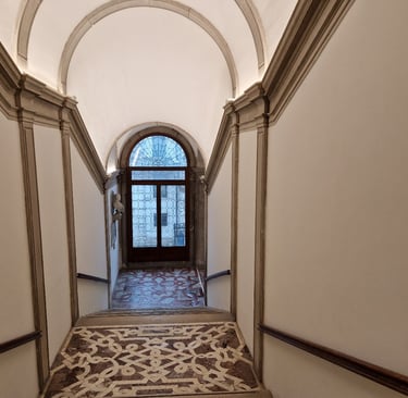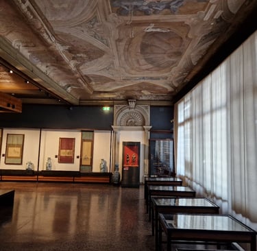 Allez, on va maintenant visiter la Cà Pesaro ! On repasse devant le bar puis l’église et on poursuit tout droit… On passe sous le sottoportego del Fenester