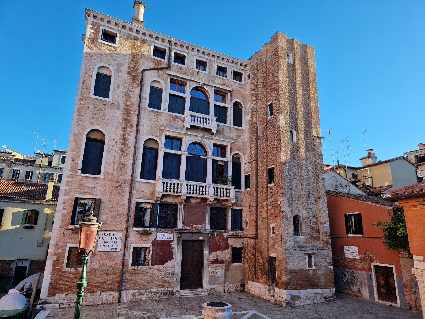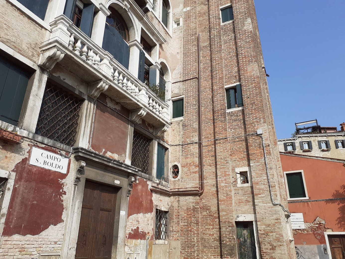 Oui, ce campanile, qui date du XIVème siècle, a perdu sa partie supérieure et il est effectivement devenu un immeuble d’habitation ! Il est accolé au palais Businello, dit aussi palais San Boldo, construit au XVIème siècle. Il y avait auparavant une église, qui a été démolie en 1826. Elle était dédiée à Sant’Ubaldo, un saint du XIIème siècle, originaire de Gubbio, en Ombrie….