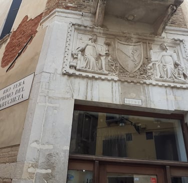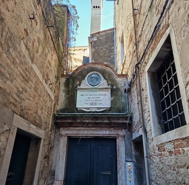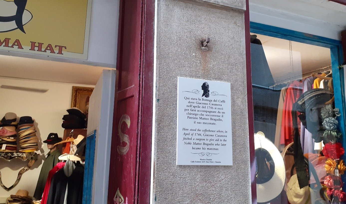 Sur le côté gauche, une plaque rappelle l’emplacement d’un café où Casanova rentra lorsqu’il chercha un médecin pour le sénateur Bragadin.