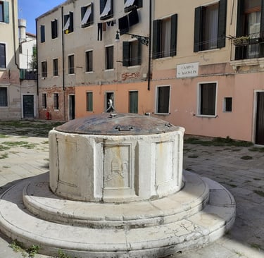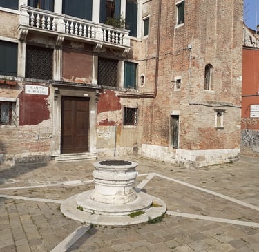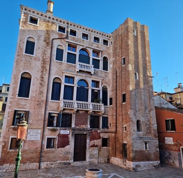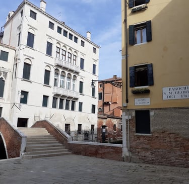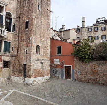 Une petite place où sont réunis les trois styles architecturaux prédominants à Venise : vénéto-byzantin, gothique et Renaissance. A droite, se trouve la Cà Barbaro, refaite au XVème siècle dans le style Renaissance mais qui conserve au premier étage une fenêtre à quatre ouvertures et des arcs à trois lobes de style gothique et en-dessous, une corniche à quatre lobes qui représentait les armoiries de la famille Barbaro ; sur le lobe inférieur, on peut encore lire : Malo mori Quam Fedari, c’est-à-dire : « Je préfère mourir plutôt que trahir ».