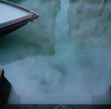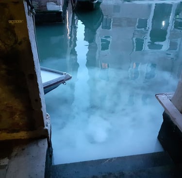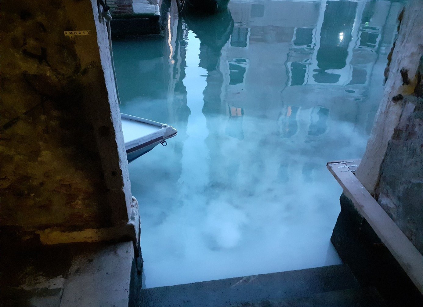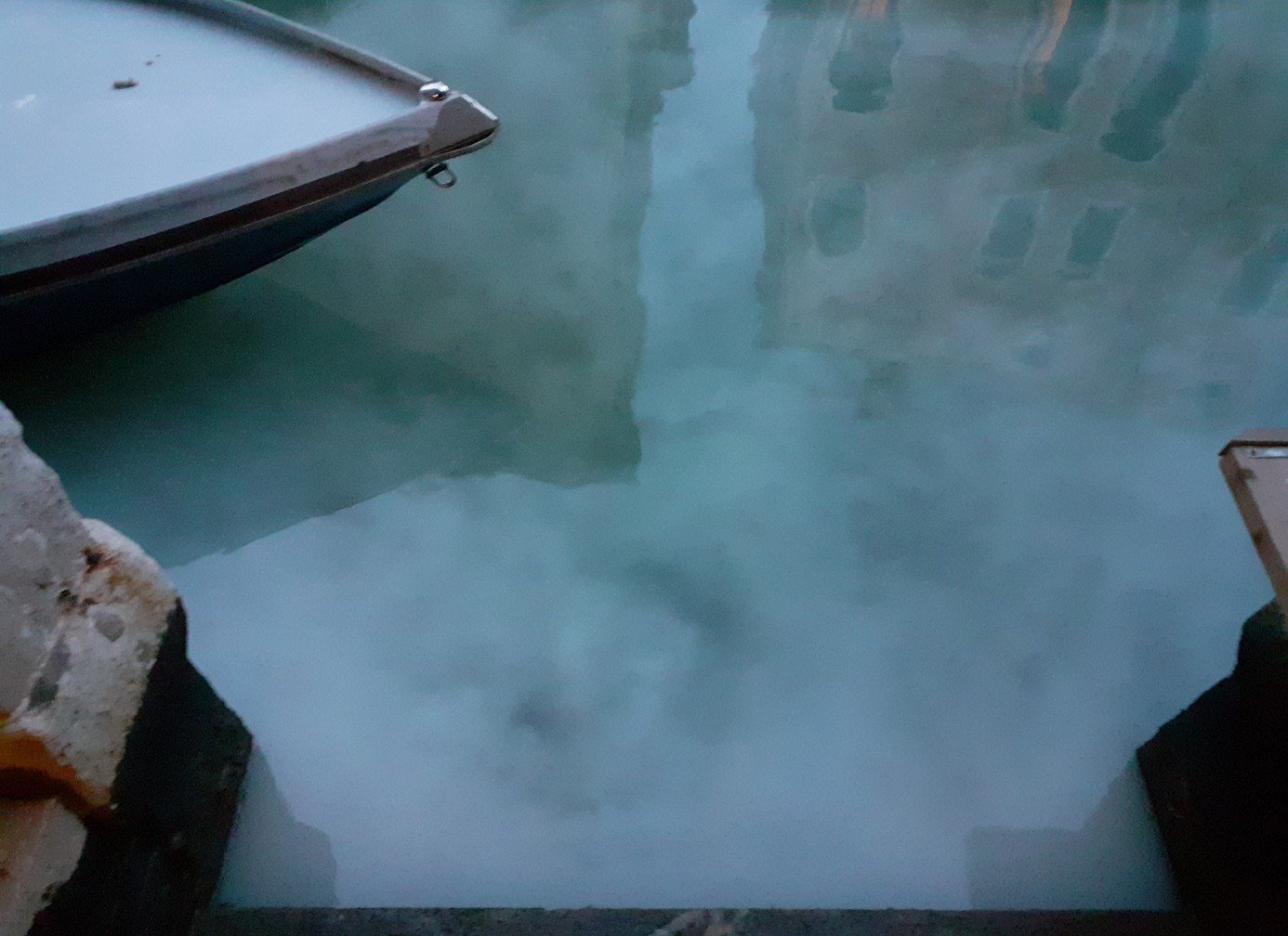 Oui, elle portait une robe bleue et je t’avais dit que sa silhouette voguait la nuit sur le rio Malpaga vers le Grand Canal…. Eh bien, on pense que le fantôme de Selima a élu domicile ici et les bulles que tu vois proviennent de sa respiration.