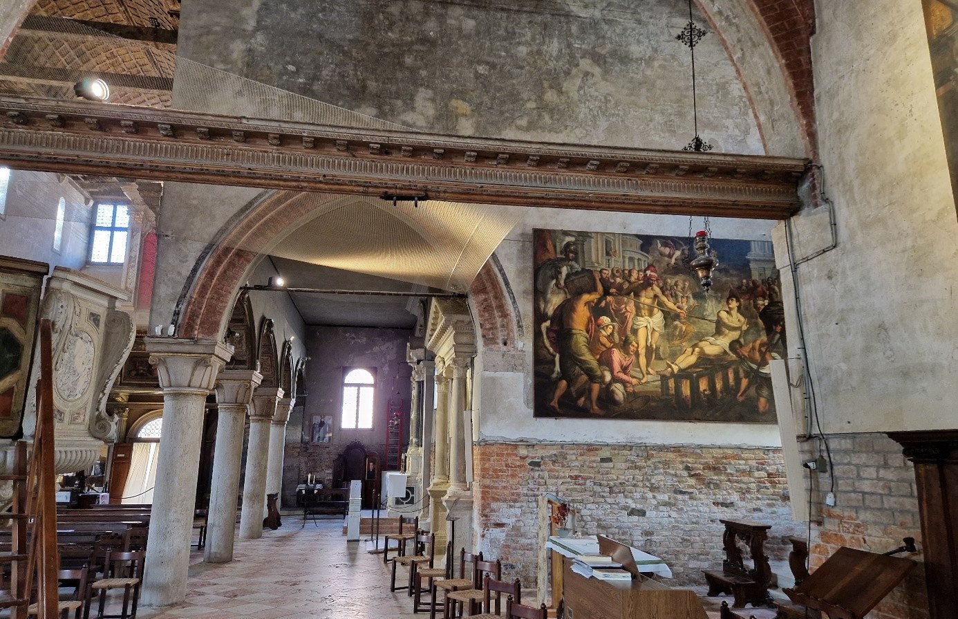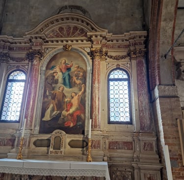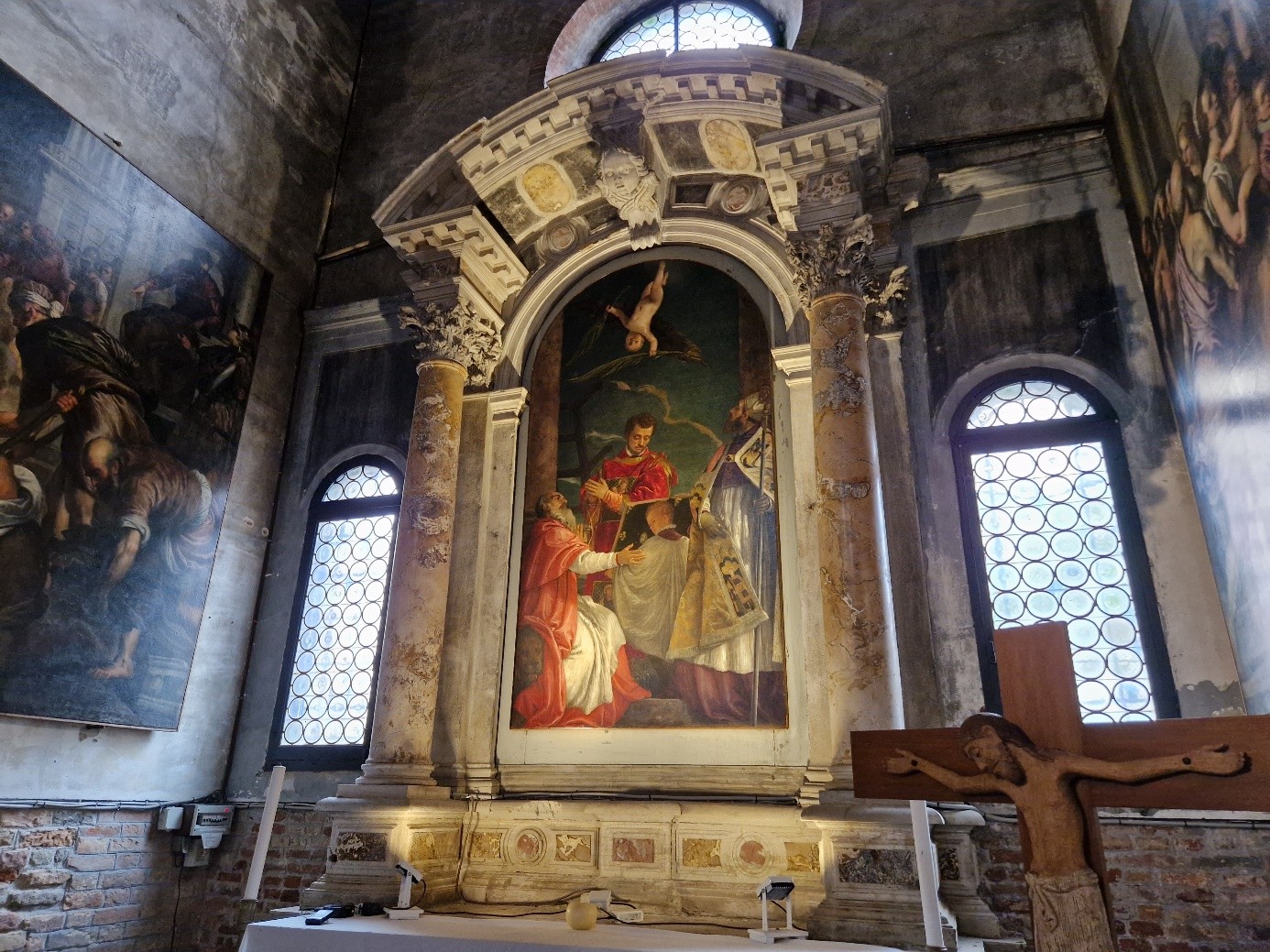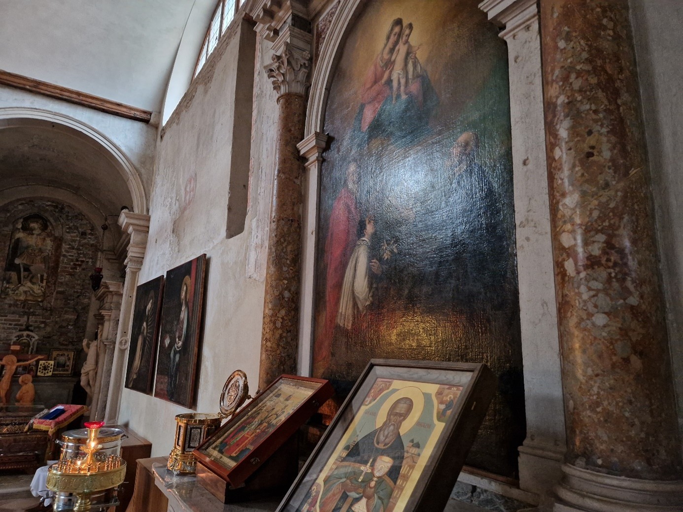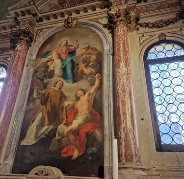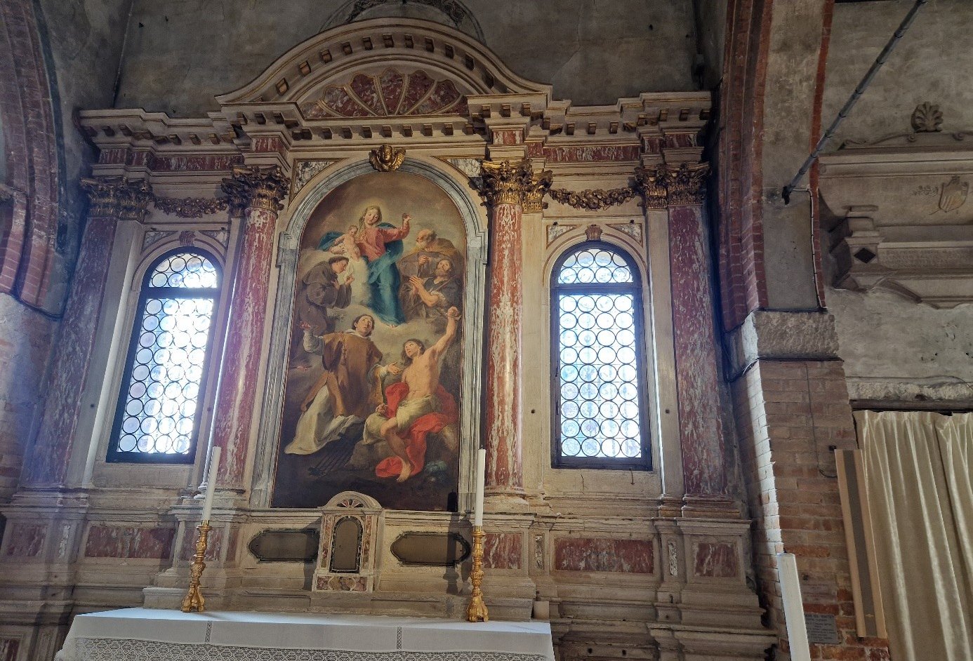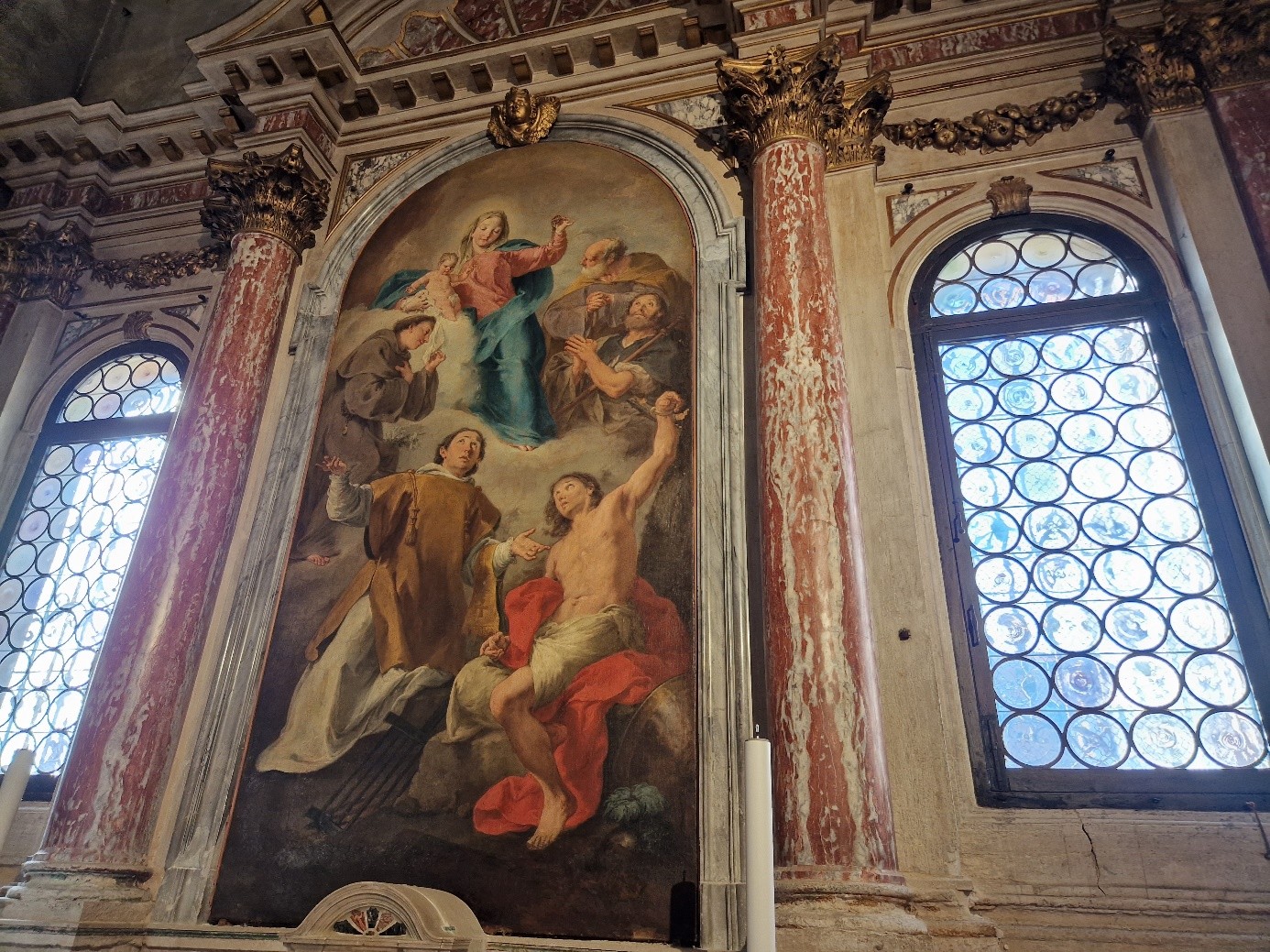 L’église abrite des œuvres mais aussi le tombeau de Giambattista Pittoni, un peintre vénitien mort le 6 novembre 1767, qui a peint dans cette église cette sainte conversation avec en haut la Vierge et son enfant, à sa gauche Joseph et en-dessous de Joseph, San Giacomo. A droite de Marie, Antonio donne un baiser à l’extrémité du drap avec lequel la Vierge soutient l’enfant Jésus. En-dessous, au premier plan, on trouve les saints Lorenzo et Sebastiano.