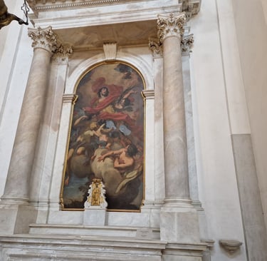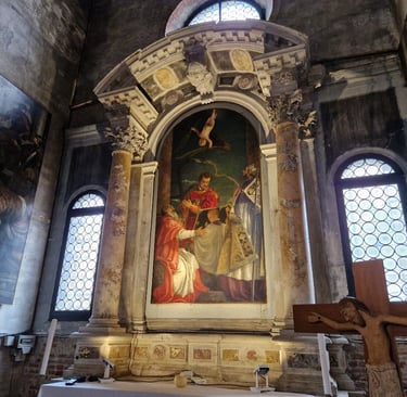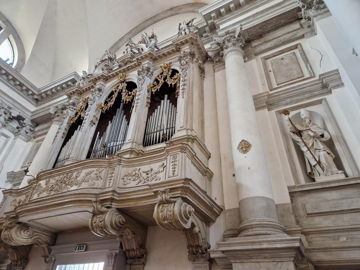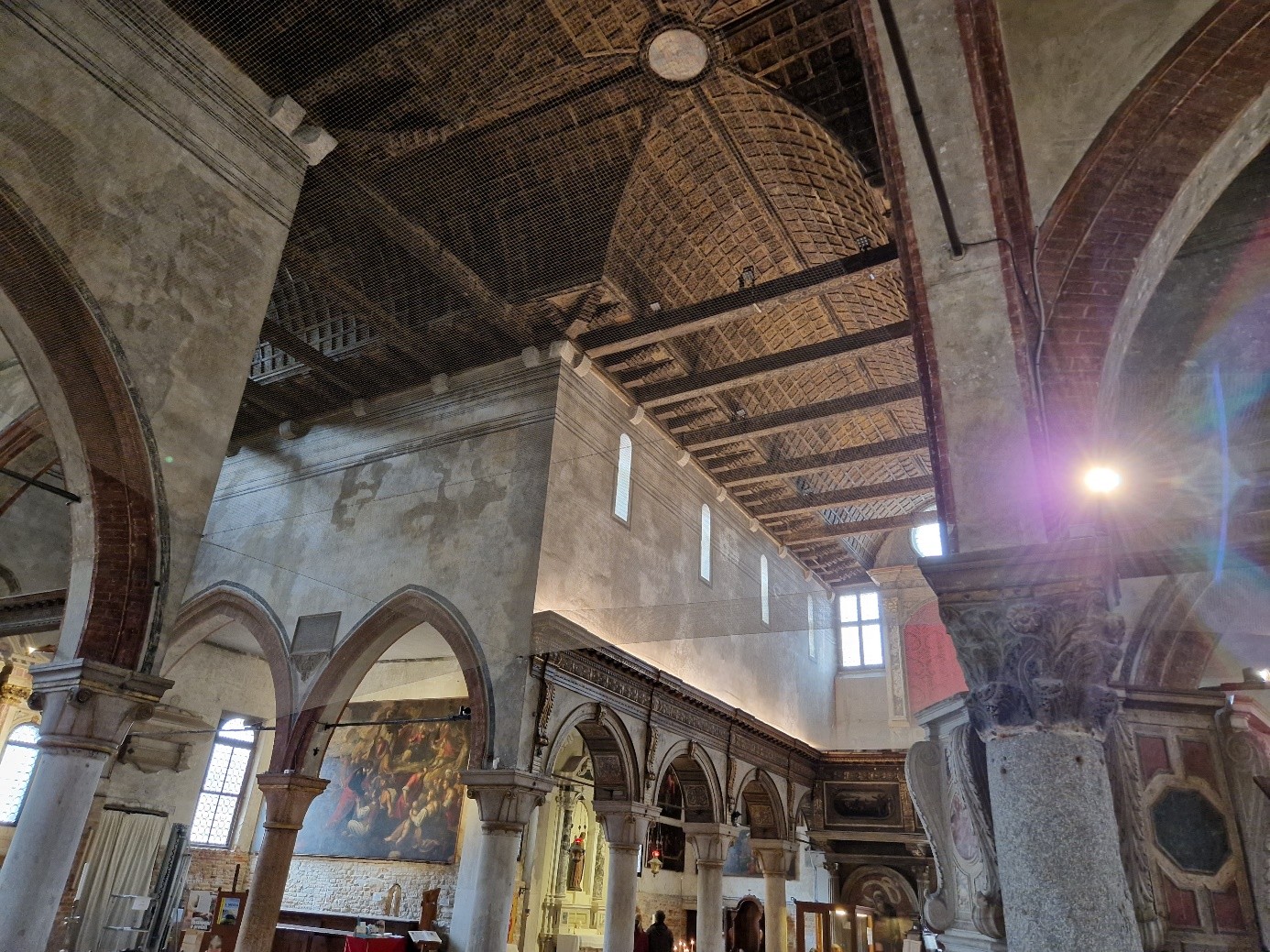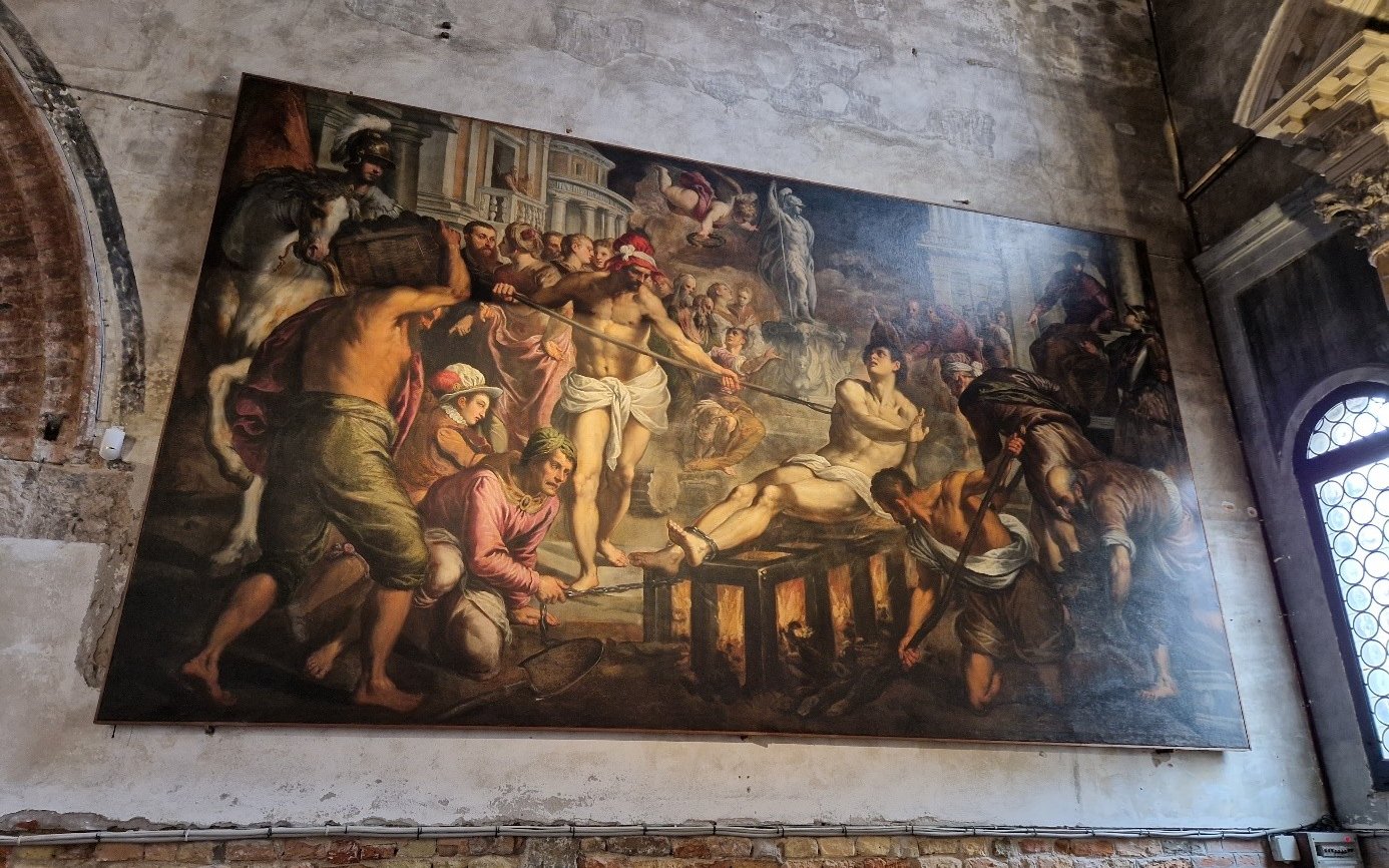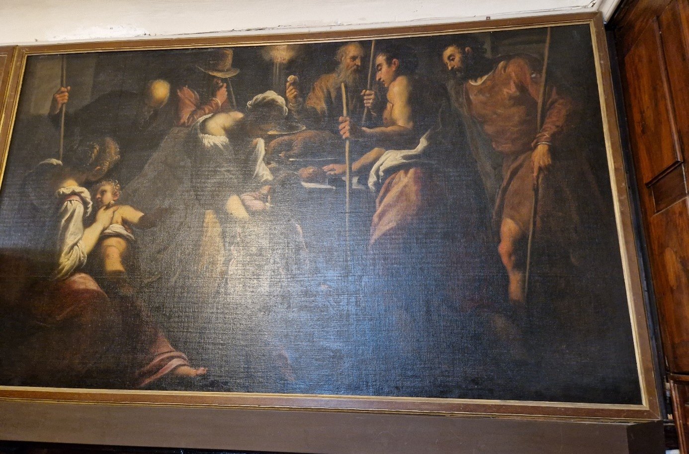 L’église abrite des œuvres mais aussi le tombeau de Giambattista Pittoni, un peintre vénitien mort le 6 novembre 1767, qui a peint dans cette église cette sainte conversation avec en haut la Vierge et son enfant, à sa gauche Joseph et en-dessous de Joseph, San Giacomo. A droite de Marie, Antonio donne un baiser à l’extrémité du drap avec lequel la Vierge soutient l’enfant Jésus. En-dessous, au premier plan, on trouve les saints Lorenzo et Sebastiano.