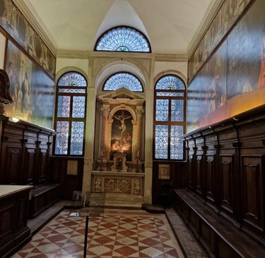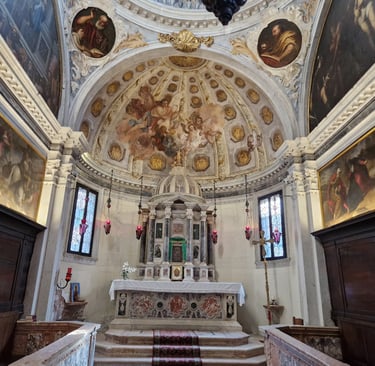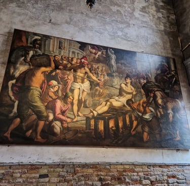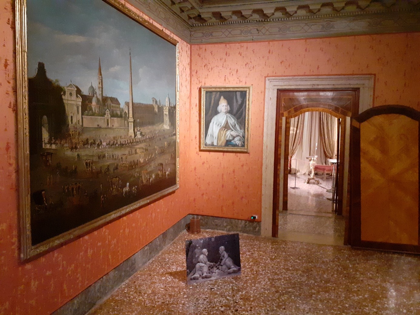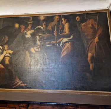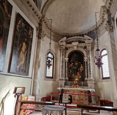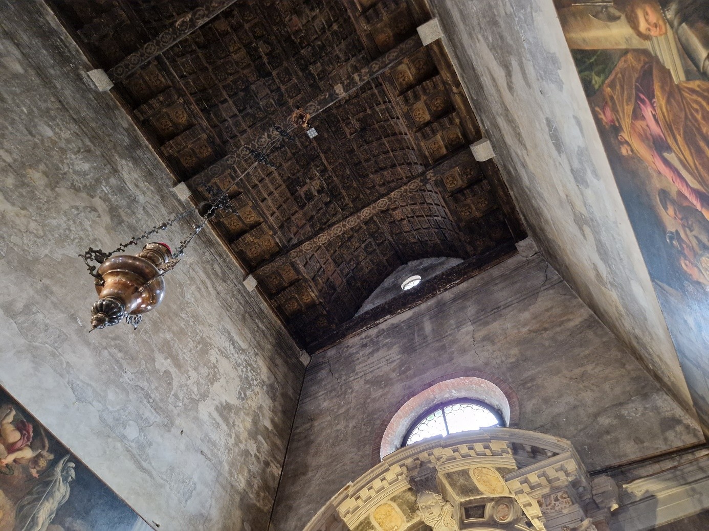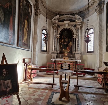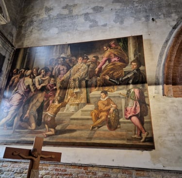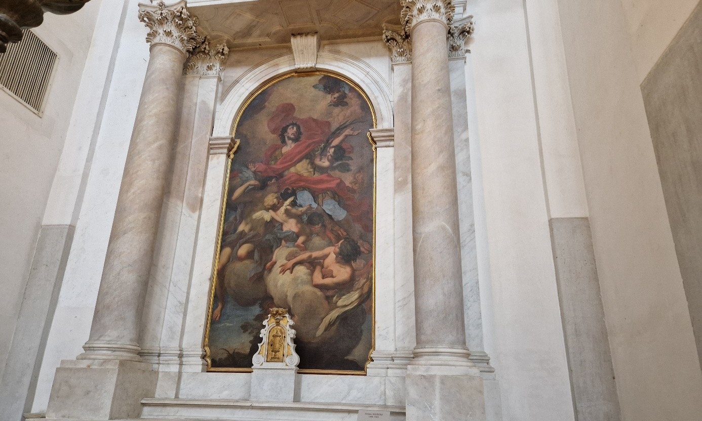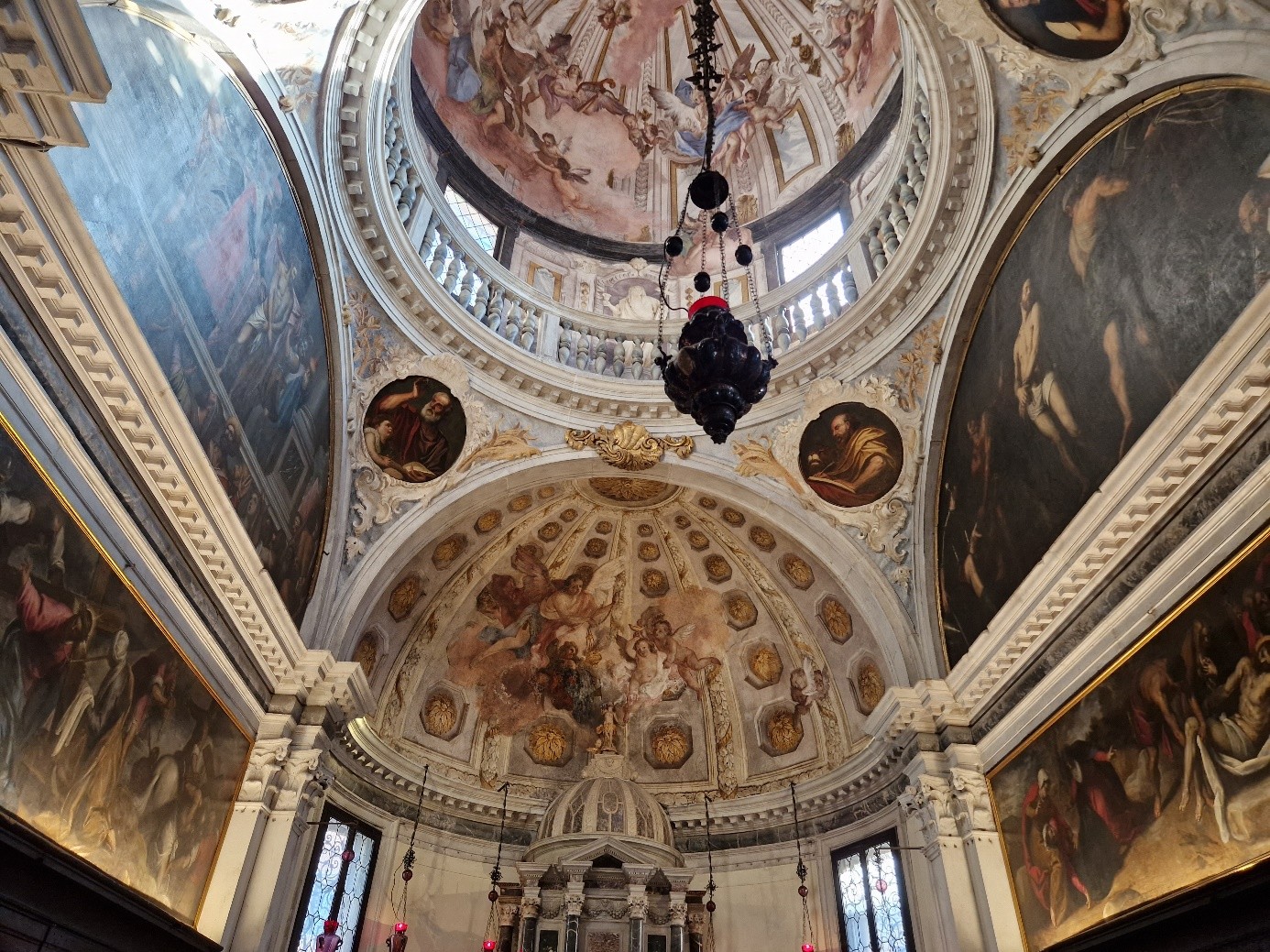 L’église abrite des œuvres mais aussi le tombeau de Giambattista Pittoni, un peintre vénitien mort le 6 novembre 1767, qui a peint dans cette église cette sainte conversation avec en haut la Vierge et son enfant, à sa gauche Joseph et en-dessous de Joseph, San Giacomo. A droite de Marie, Antonio donne un baiser à l’extrémité du drap avec lequel la Vierge soutient l’enfant Jésus. En-dessous, au premier plan, on trouve les saints Lorenzo et Sebastiano.