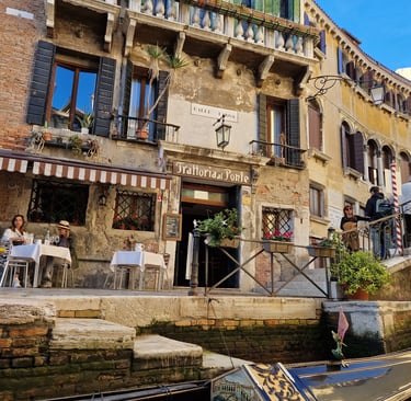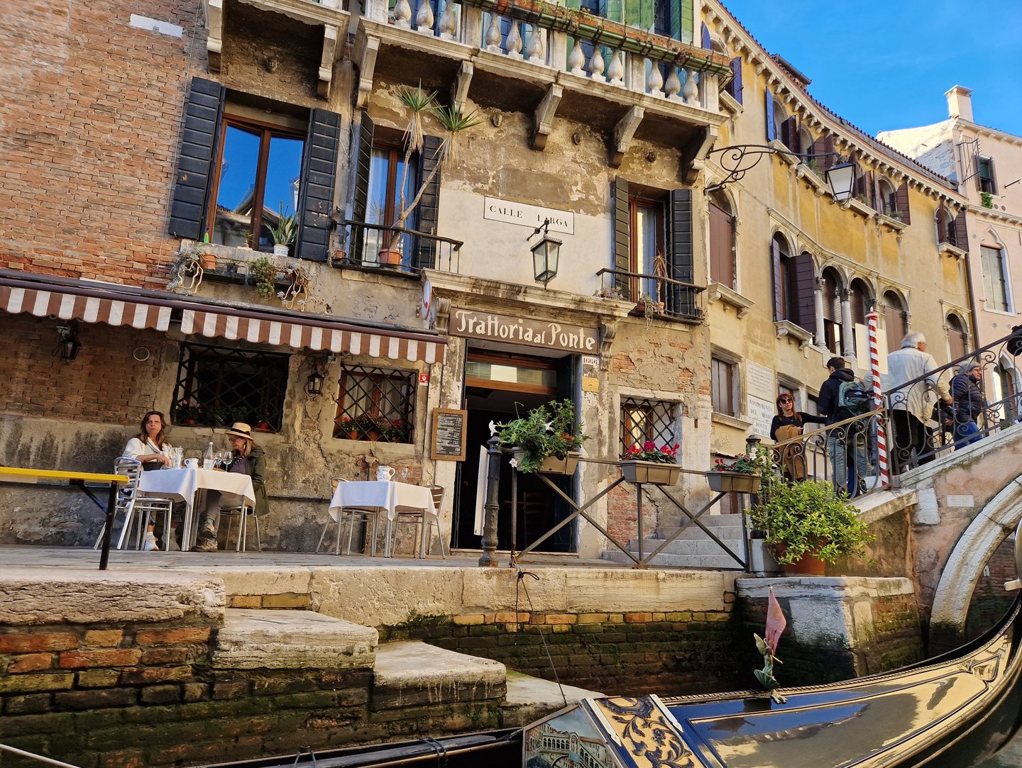 On va maintenant rejoindre traverser la place et dîner au restaurant près du pont sous lequel on est passé en gondole : Al Ponte del Megio.