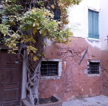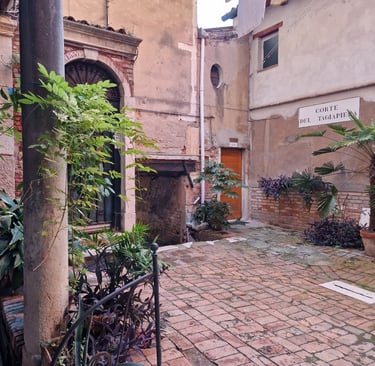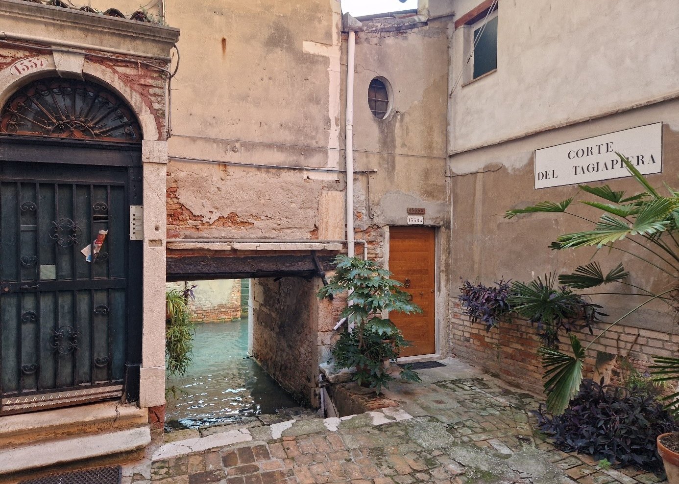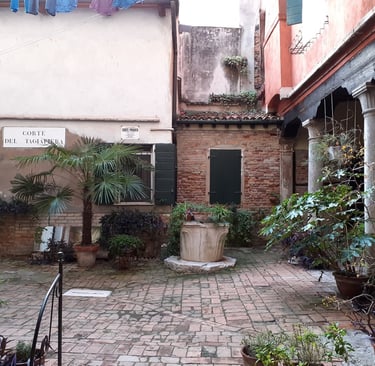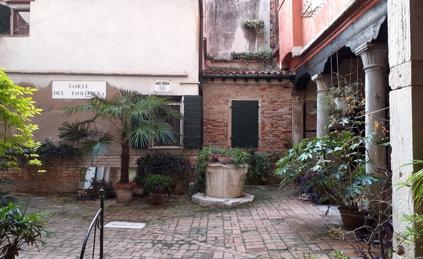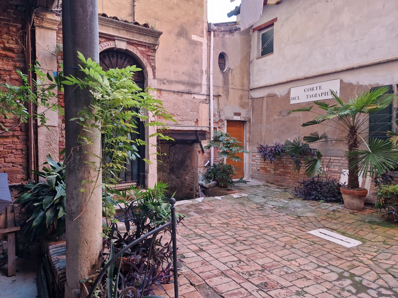 Maintenant, je t’emmène voir une très belle petite cour : la corte Tagliapietra. On prend la calle del tentor et la quatrième ruelle à droite : le ramo de le Oche… Nous voici dans la corte Tagliapietra.