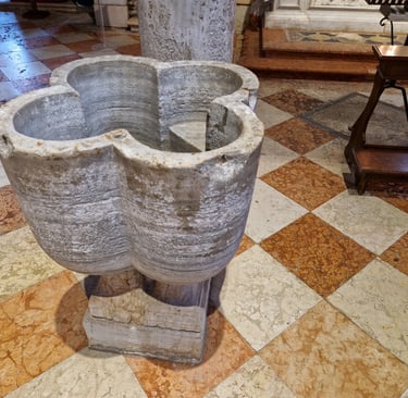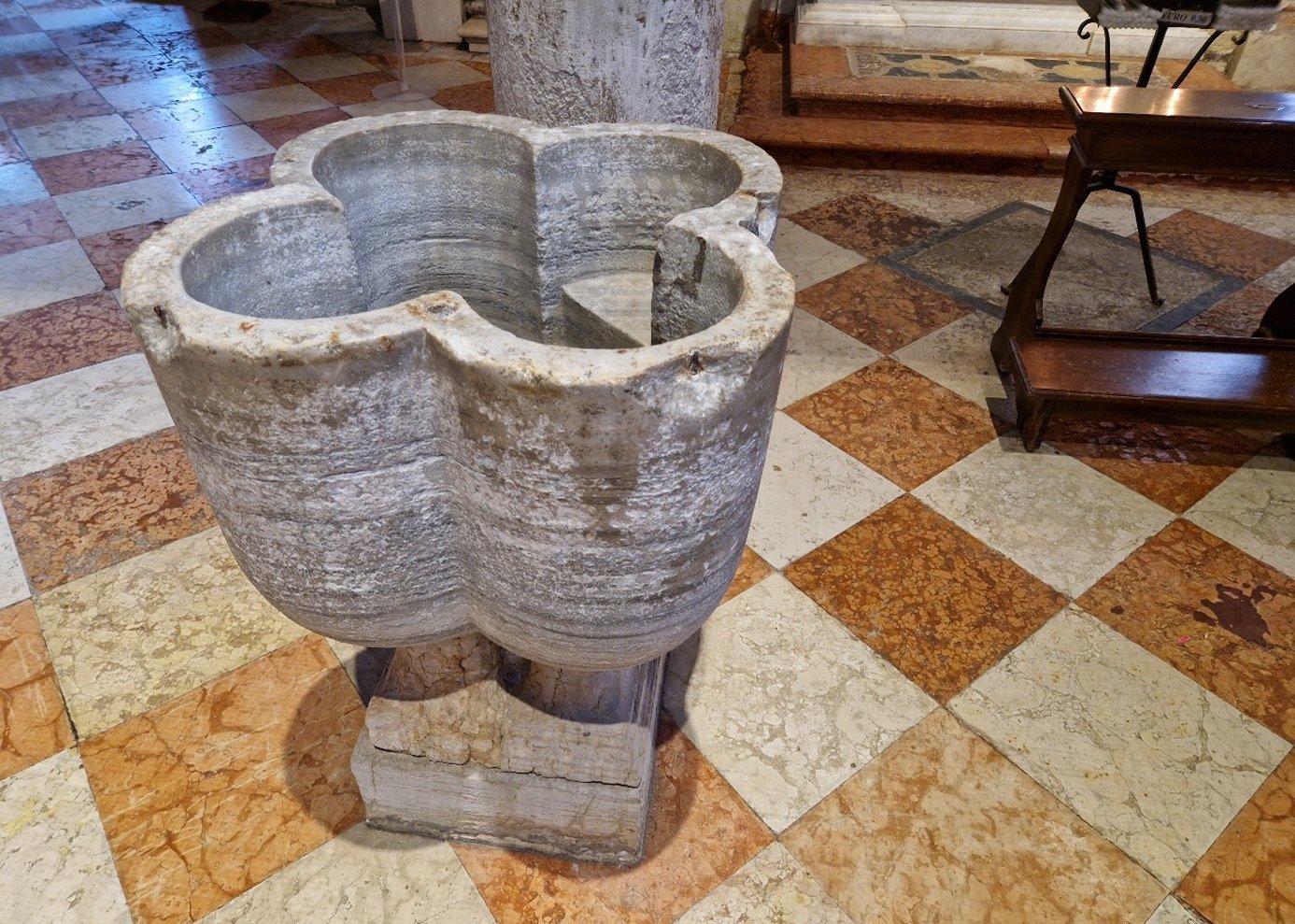 Et ce beau bénitier quadrilobé, en marbre cipollino d’Anatolie !
