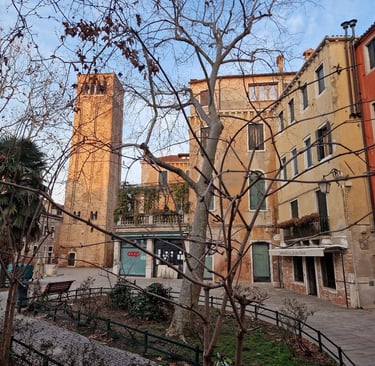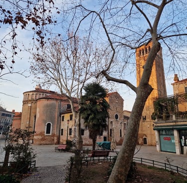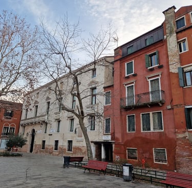 On va maintenant rejoindre le campo San Giacomo dell’Orio, la place la plus populaire de Venise. De la salizada, on prend à gauche le ramo secondo del Megio… et la fondamenta del Megio à droite… On continue tout droit par la calle Larga, où on longe de beaux palais…