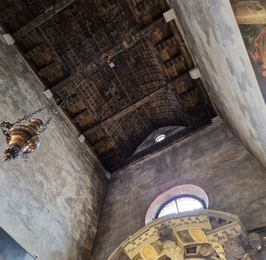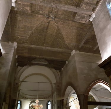 Entrons ! Regarde le plafond en bois en forme de carène de navire ! Il date du XIVème siècle.