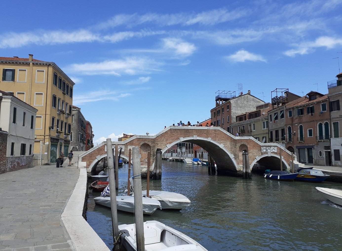 Allez ! on prend le canal de Cannaregio pour rejoindre l’îlot de San Giobbe ! On va passer sous le pont des Guglie. Il s’appelait auparavant le pont de Cannaregio. Le premier fut construit en bois en 1285. C’est en 1580 qu’il fut construit en pierre et restauré en 1641 et 1777 ; il prit alors le nom de Ponte delle Guglie, du fait des obélisques dont il est orné à chaque extrémité… Après avoir laissé le rio della Crea sur notre gauche, on arrive à notre îlot… On longe la fondamenta San Giobbe… On passe sous le pont des Trois arches, qui, comme celui des Guglie, a changé de nom : il s’appelait autrefois ponte San Giobbe, d’abord en bois puis en pierre en 1503 ; il a sa forme actuelle depuis 1688 et les travaux de l’architecte Tirali ; il fut restauré en 1794… On va prendre le rio de San Giobbe à gauche… On s’arrête sur le campo San Giobbe, le personnage biblique du livre de Job…