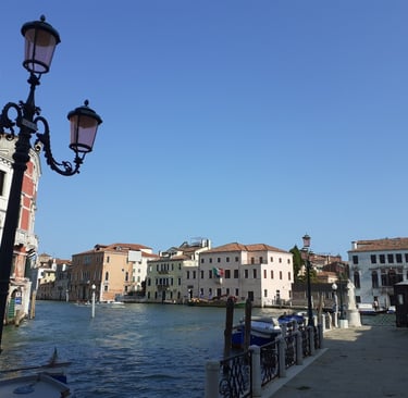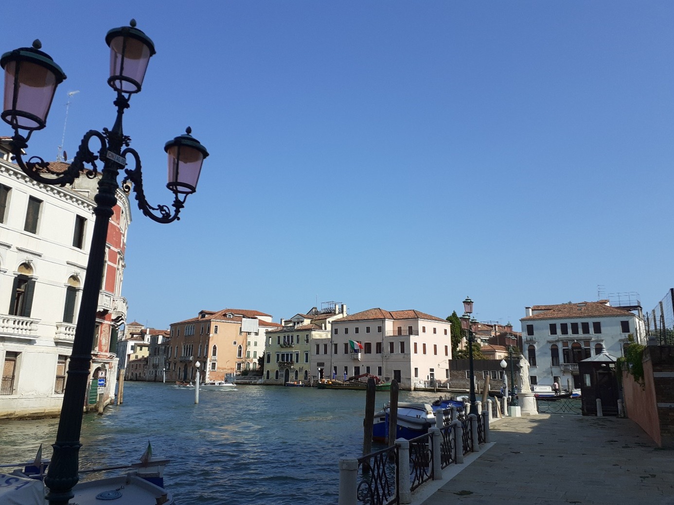 Oui, on fêtera ça ce soir avec un verre de prosecco ! Mais d’abord, on va prendre le rio dei Tolentini sur la droite pour rejoindre le Grand Canal… on prend le grand Canal à droite… On passe sous le pont des Scalzi !