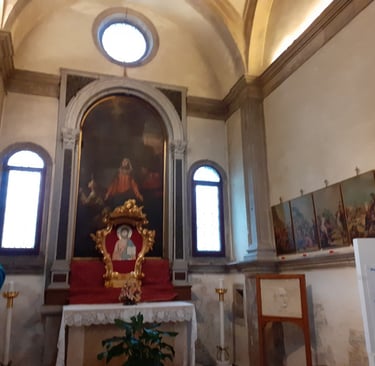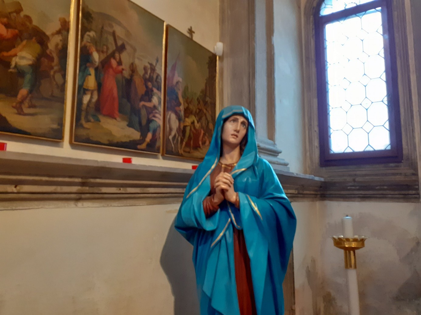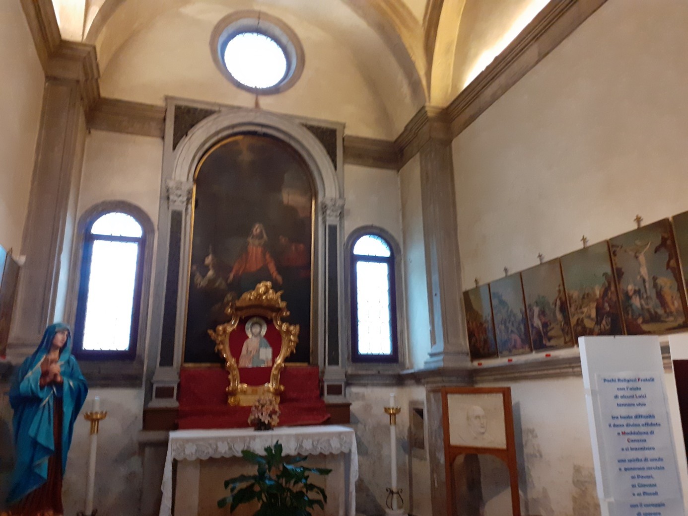 Au-dessus de l'autel, une toile de carlo zatti représente la Vierge au tombeau du Chris, au moment où tombent les ténèbres du premier Vendredi Saint. Derrière, on aperçoit la Croix plantée sur la colline. Sainte Marie Madeleine avance les mains sur la paroi du tombeau tandis que la Vierge Marie, les yeux levés au ciel, écarte les bras dans un geste de soumission à la volonté de Dieu. Derrière, Saint-Jean Baptiste se tient prêt à soutenir Marie.... Le long des murs de chaque côté, des cadres rappellent le chemin de croix de Jésus...
