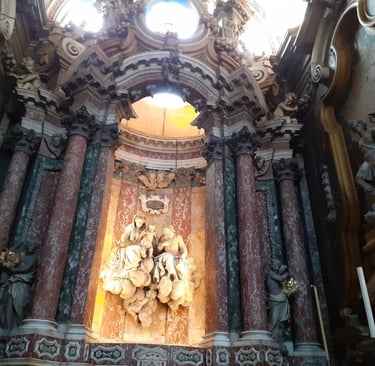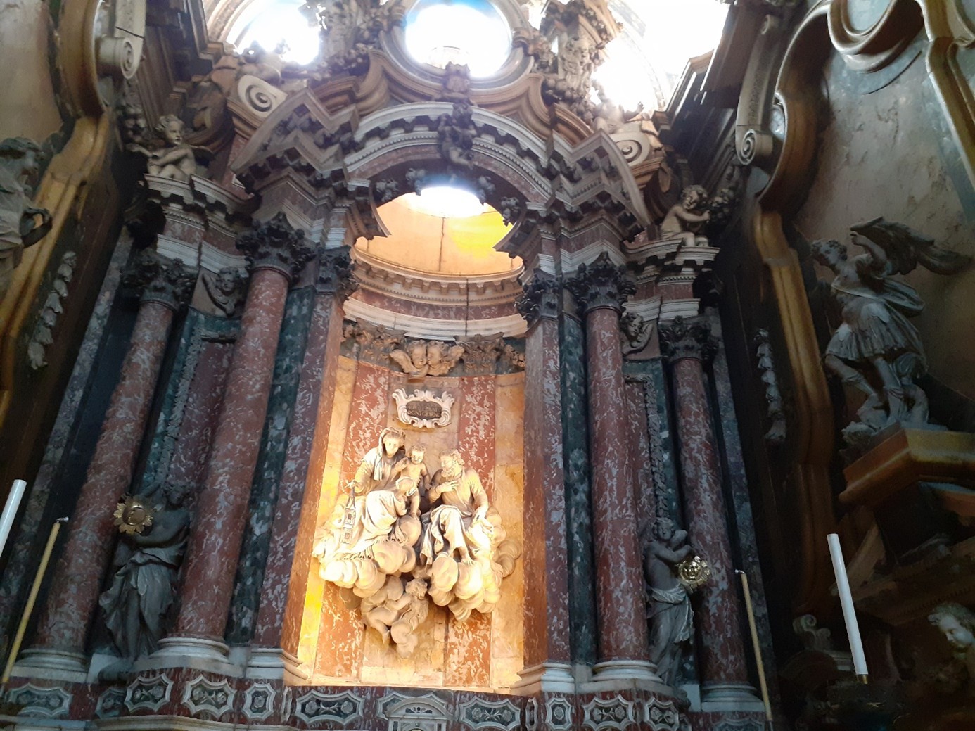 Oui, c'est du marbre de Carrare, revêtu de rouge dit "de France". Le groupe sculpté de la Sainte Famille serait de Heinrich Meyring. En revanche, la statue de San Michele, à droite, est de Giuseppe Torretti.