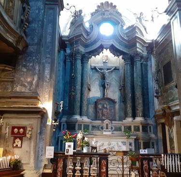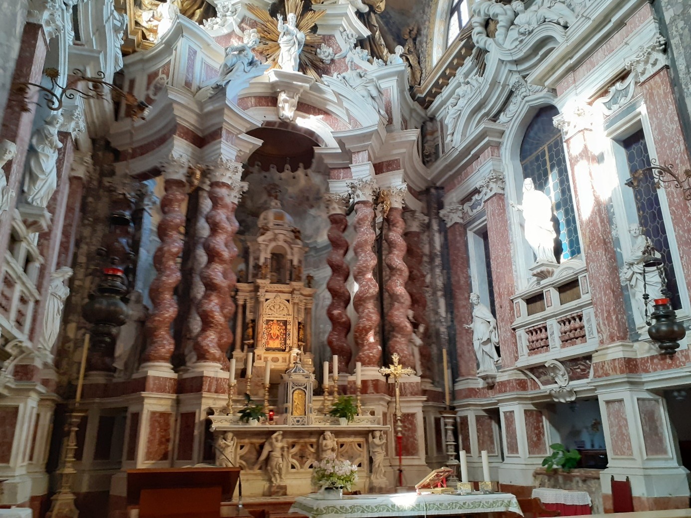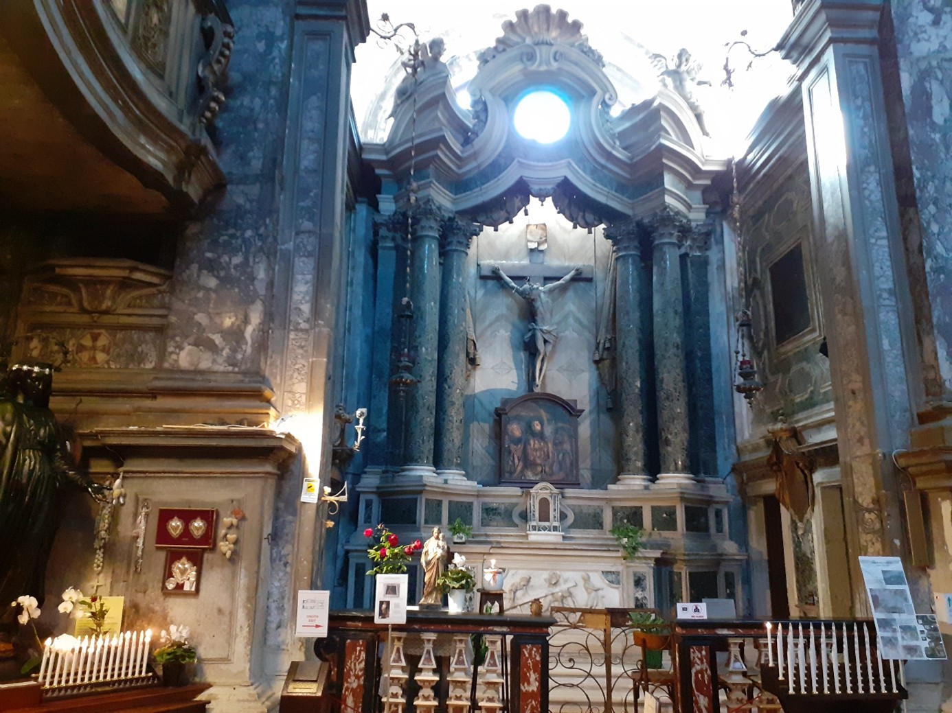 Le crucifix et le petit retable en-dfessous, qui représente la chute du Christ crucifié, ont été réalisés par le sculpteur Giovanni Maria Morlaiter.