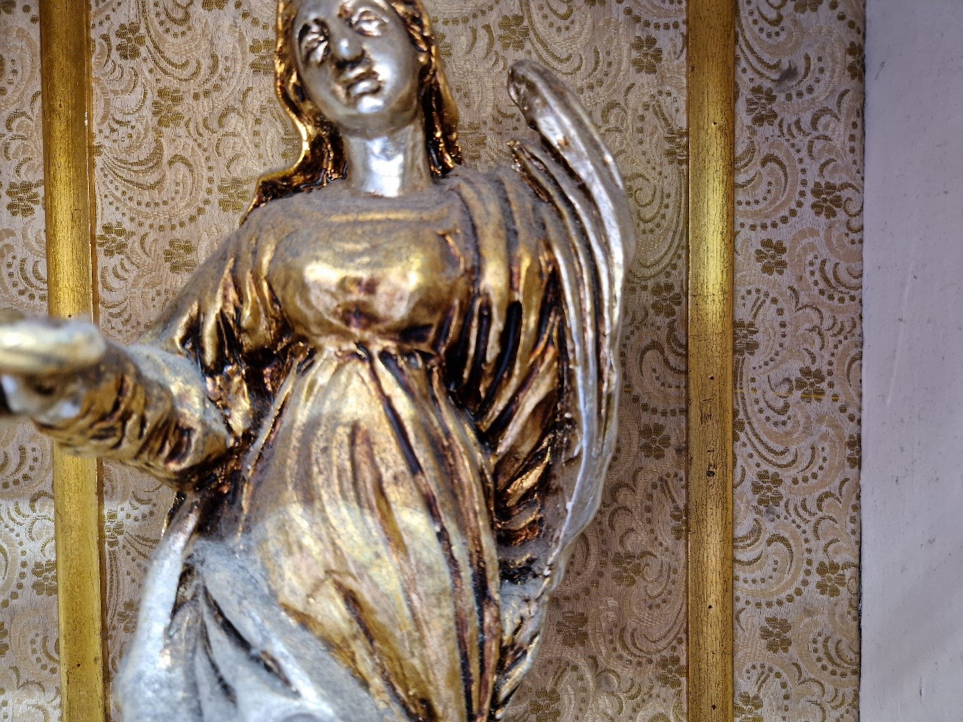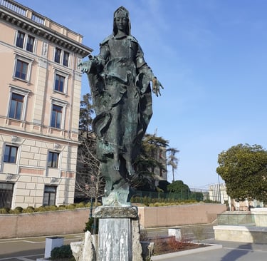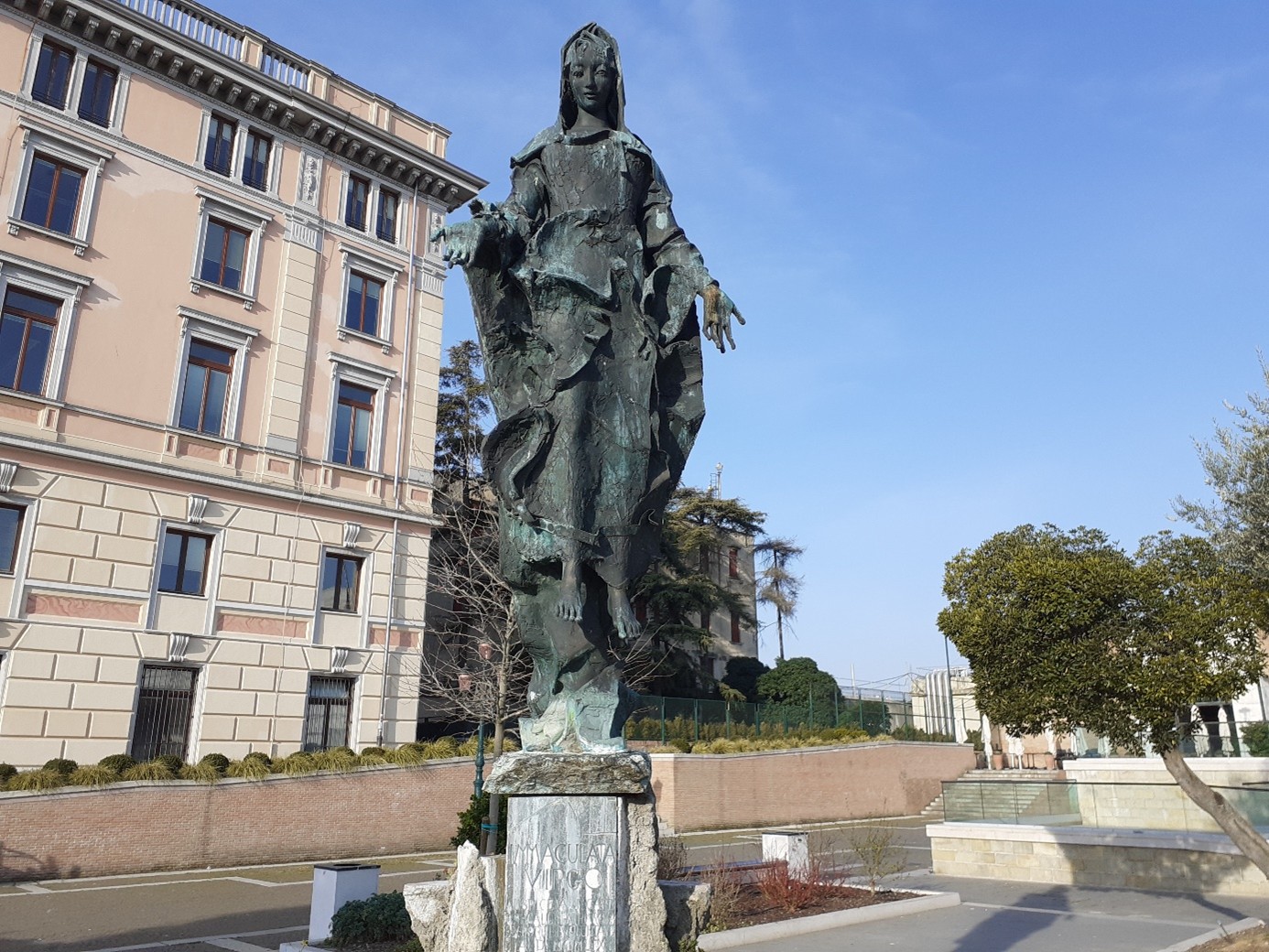 Alors qu’il y en a deux à Syracuse ! Retournons sur la place ! Sur la droite, il y a aussi une statue de la Vierge Immaculée, qui est dédiée à la naissance mythique de Venise, le 25 mars 421, puisque celle-ci a été fixée selon la légende au jour où l’archange Gabriel annonce à Marie qu’elle va concevoir le Fils de Dieu….