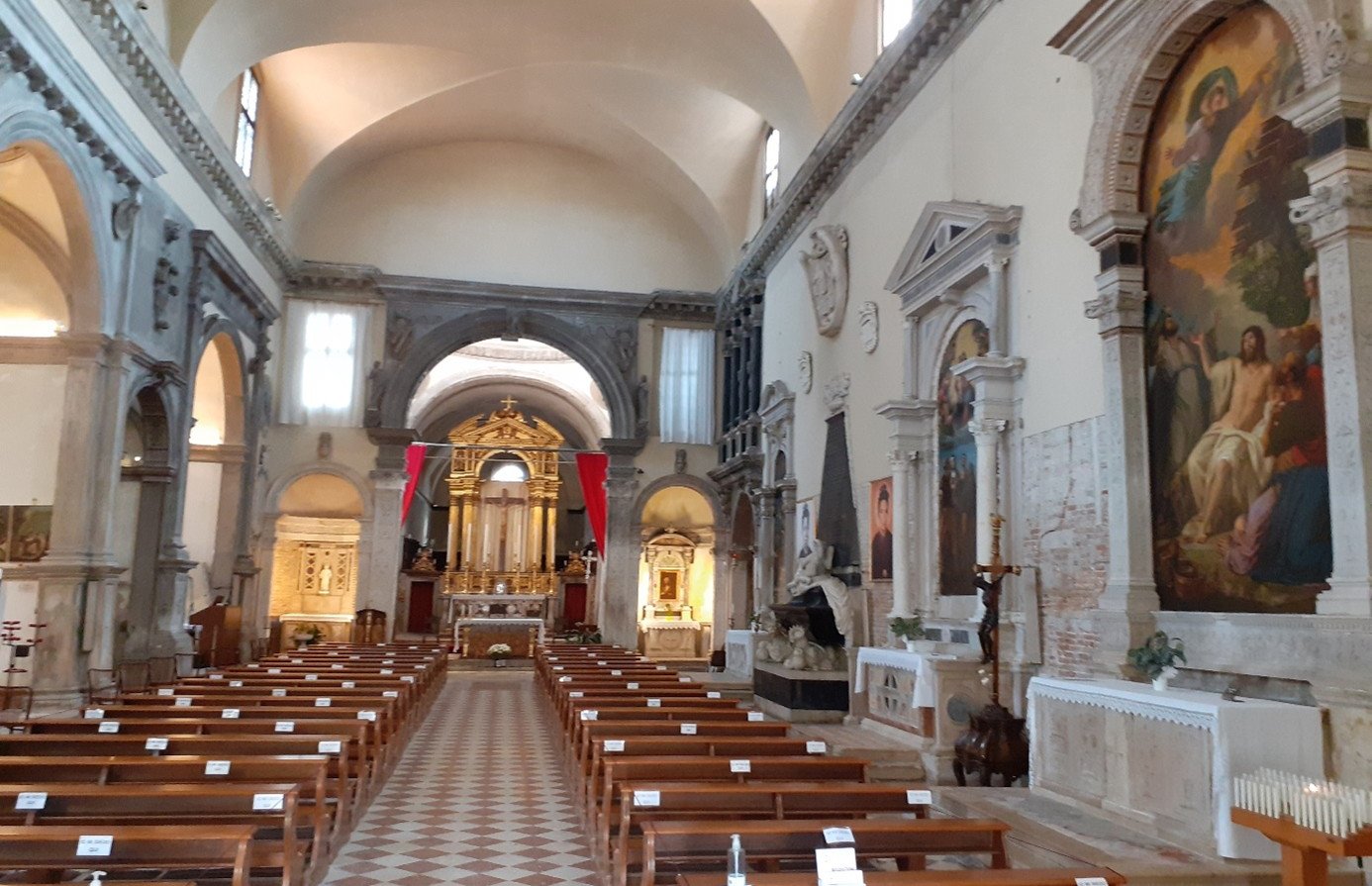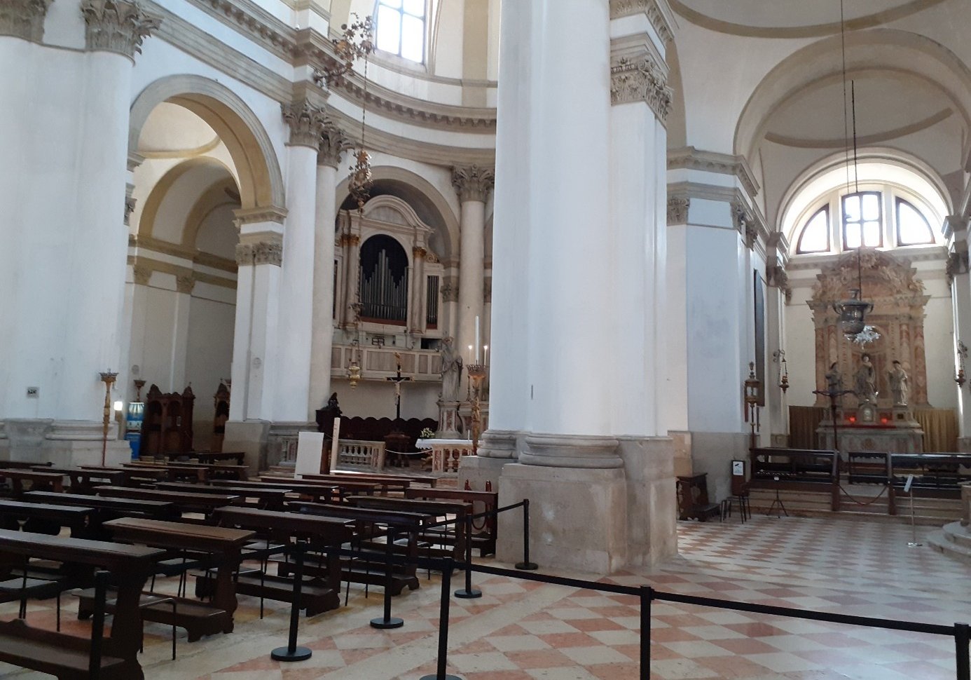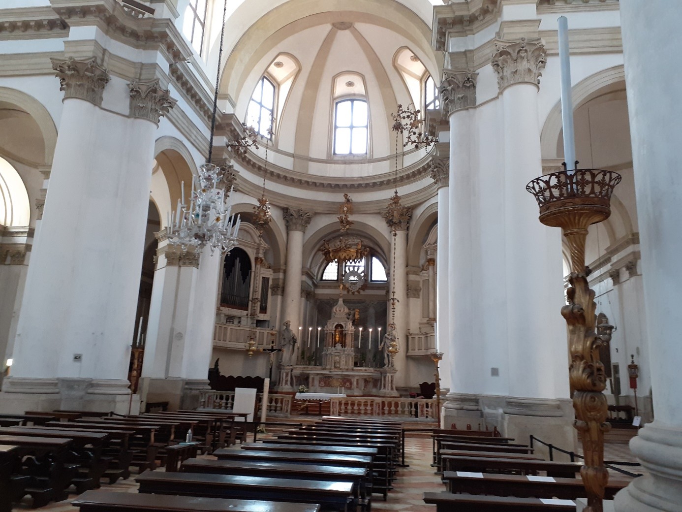 Oui, en bas, dans les niches, on trouve, de gauche à droite : San Sebastiano, Santa Maria Maddalena, Santa Margherita et San Giovanni Battista. Au-dessus, au centre, c'est la statue de la Madonna con il Bambino. C'est la plus grande car il s'agit de souligner le caractère central de la Vierge Marie pour l'ordre des Carmélites. De chaque côté de la Vierge, il y a des niches mais dans celle de droite, la statue de l'Espérance a disparu après s'être fracassée au sol. Ne subsiste que celle de la Foi à gauche. Aux extrémités, se trouvent .les statues de San Girolamo à gauche et de San Bartolomeo à droite. Sur la corniche, on trouve au centre le Christ bénissant ; à gauche Adam debout et Caïn couché sur le côté ; à droite Abel couché sur le côté et Eva debout. Entrons ! Admire la nef, qui constitue un bel exemple du baroque vénitien ! L'intérieur fut enrichi au cours du XVIIIème siècle.