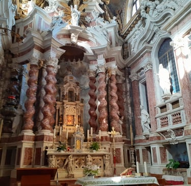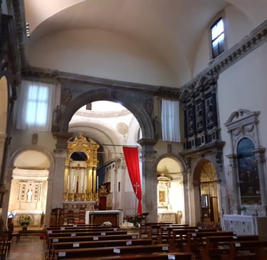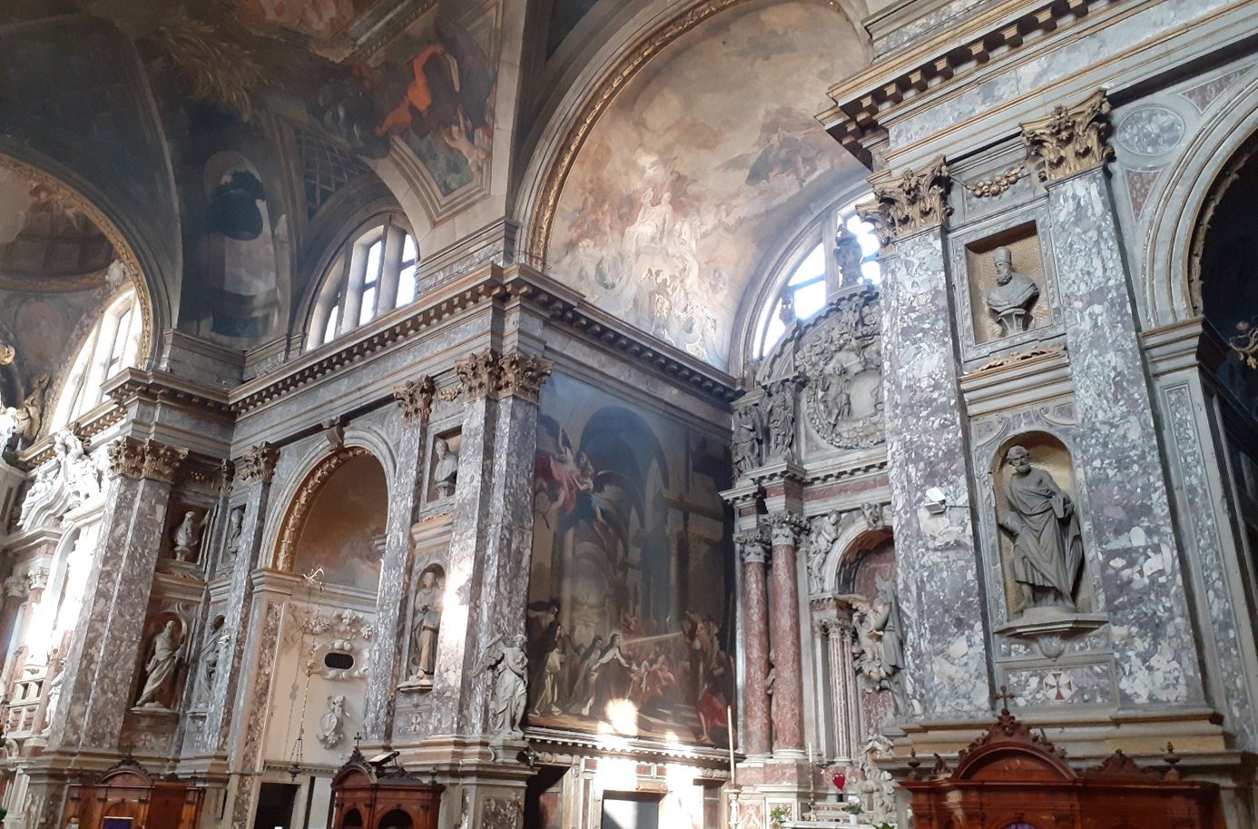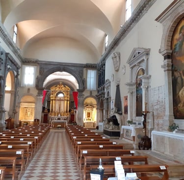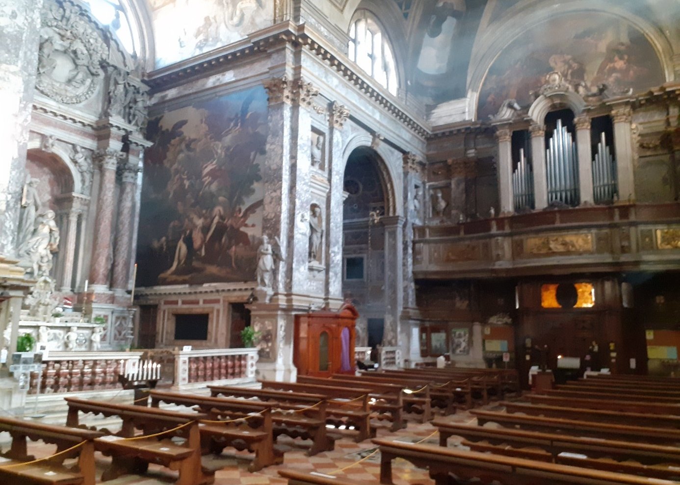 Oui, en bas, dans les niches, on trouve, de gauche à droite : San Sebastiano, Santa Maria Maddalena, Santa Margherita et San Giovanni Battista. Au-dessus, au centre, c'est la statue de la Madonna con il Bambino. C'est la plus grande car il s'agit de souligner le caractère central de la Vierge Marie pour l'ordre des Carmélites. De chaque côté de la Vierge, il y a des niches mais dans celle de droite, la statue de l'Espérance a disparu après s'être fracassée au sol. Ne subsiste que celle de la Foi à gauche. Aux extrémités, se trouvent .les statues de San Girolamo à gauche et de San Bartolomeo à droite. Sur la corniche, on trouve au centre le Christ bénissant ; à gauche Adam debout et Caïn couché sur le côté ; à droite Abel couché sur le côté et Eva debout. Entrons ! Admire la nef, qui constitue un bel exemple du baroque vénitien ! L'intérieur fut enrichi au cours du XVIIIème siècle.