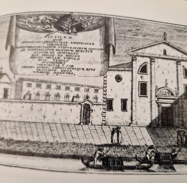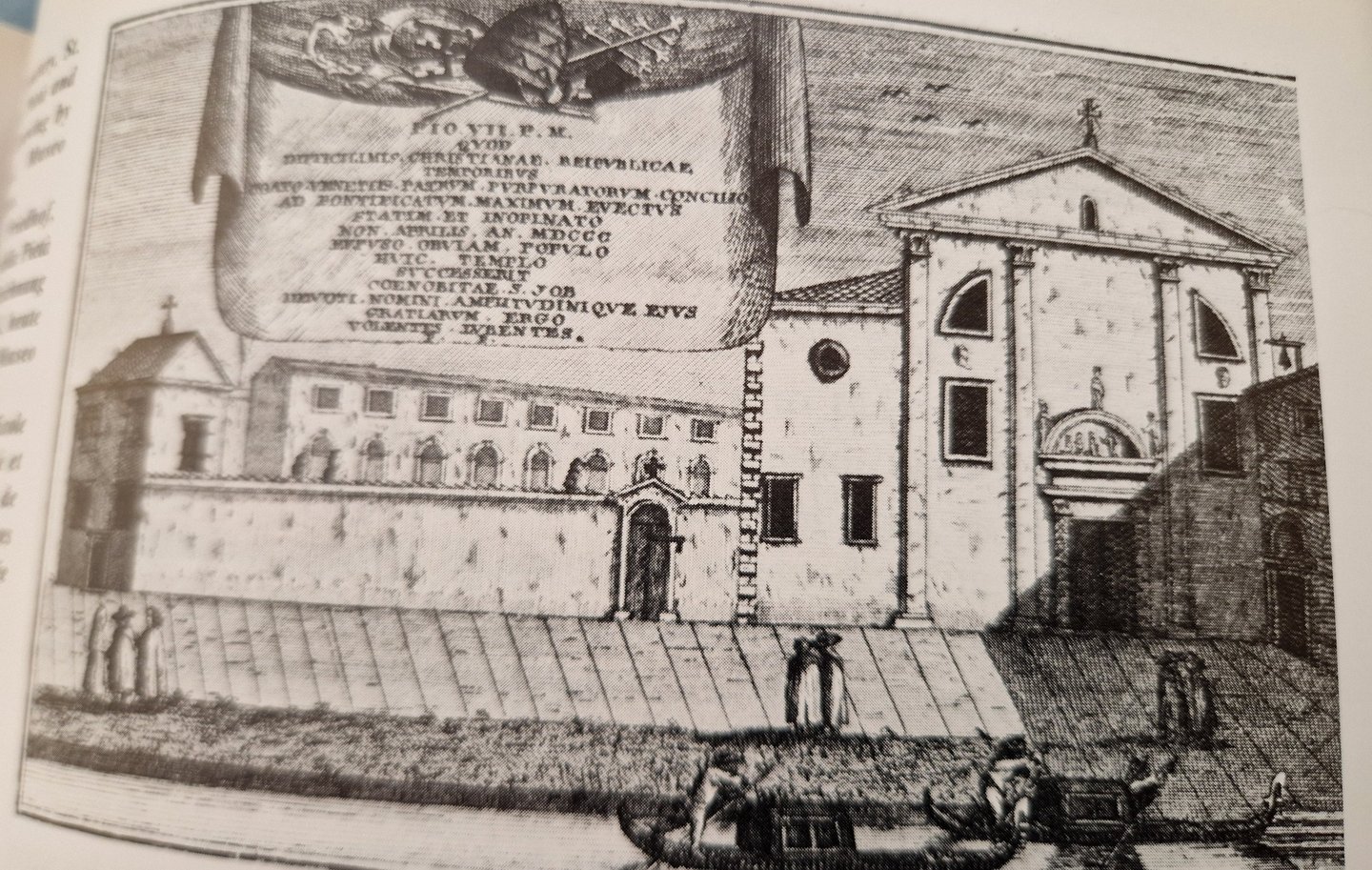 Sur la couverture, on voit les statues du portail ! Et sur un dessin, on voit l'ensemble : église, couvent, cimetière... Il y avait aussi une Scuola, Santa Maria della Pietà !