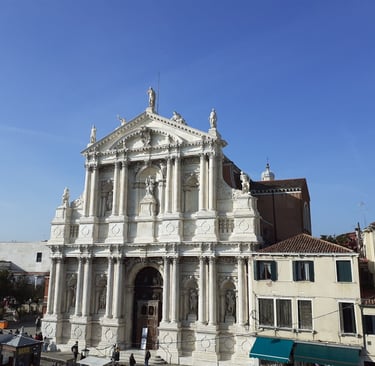 Scalzi signifie « déchaussés » en français : c’est en effet l’ordre religieux des « Carmes déchaussés » qui fonda cette église, ainsi qu’un couvent attenant, en 1649. Cette église fut appelée Santa Maria in Nazareth car y fut intégrée une image de la Vierge provenant de l’île de la lagune Santa Maria in Nazareth, appelée également il Lazzaretto Vecchio. En 1656, l’église fut démolie et remplacée par l’église actuelle, édifiée sur les plans de Longhena, entre 1660 et 1680. La façade est de Giuseppe Sardi. Elle est en marbre de Carrare.