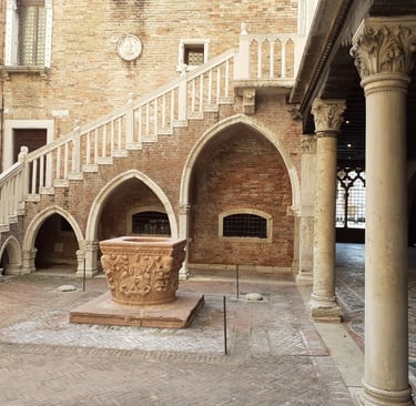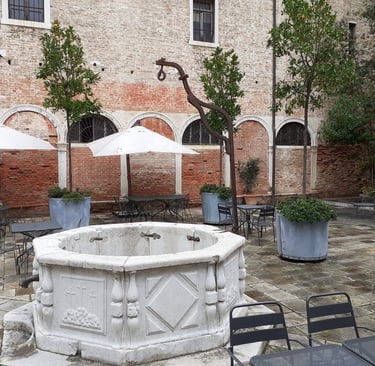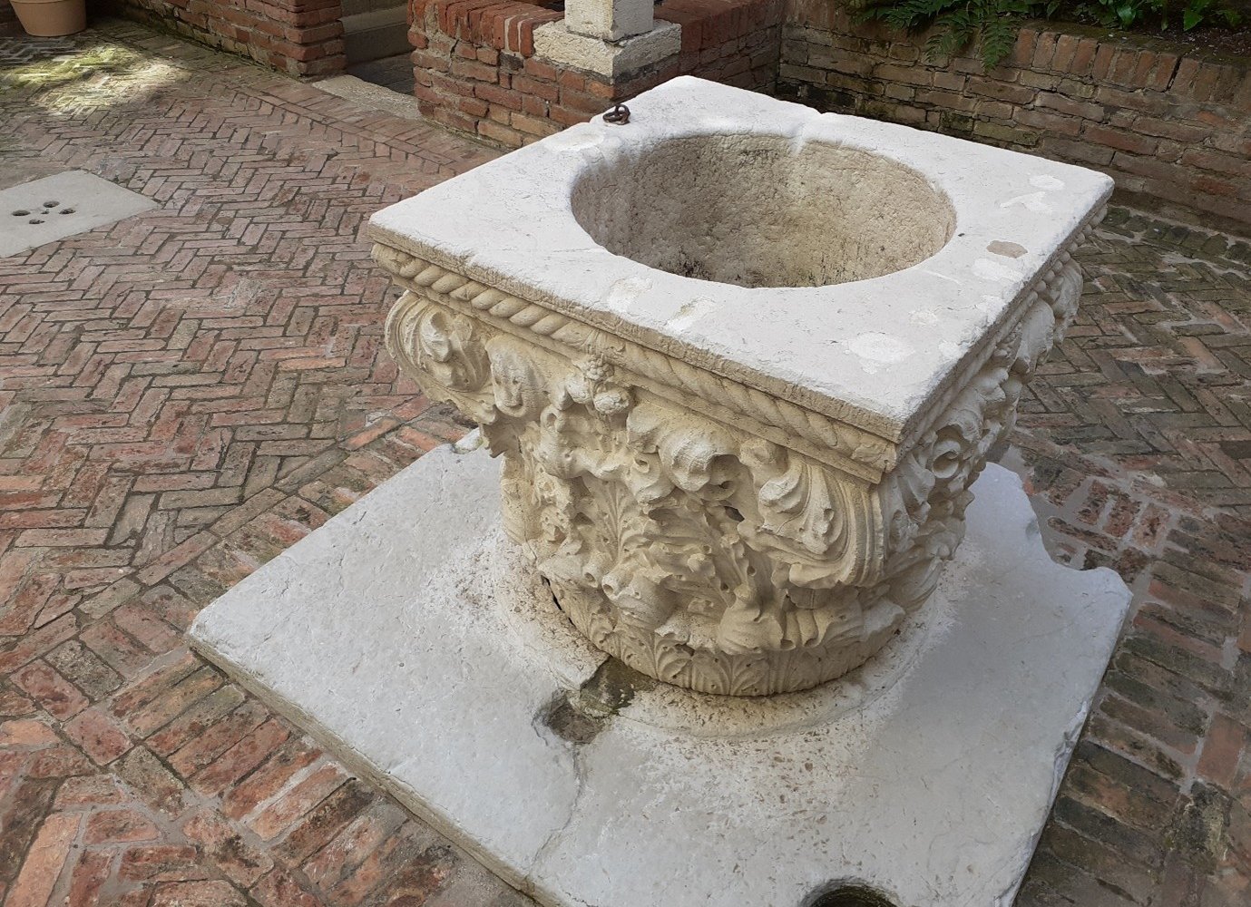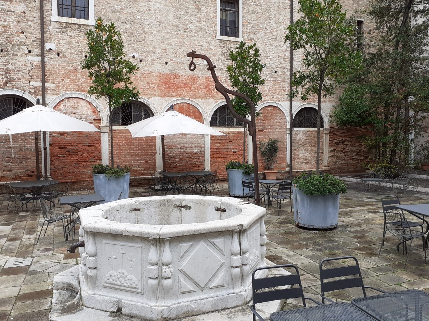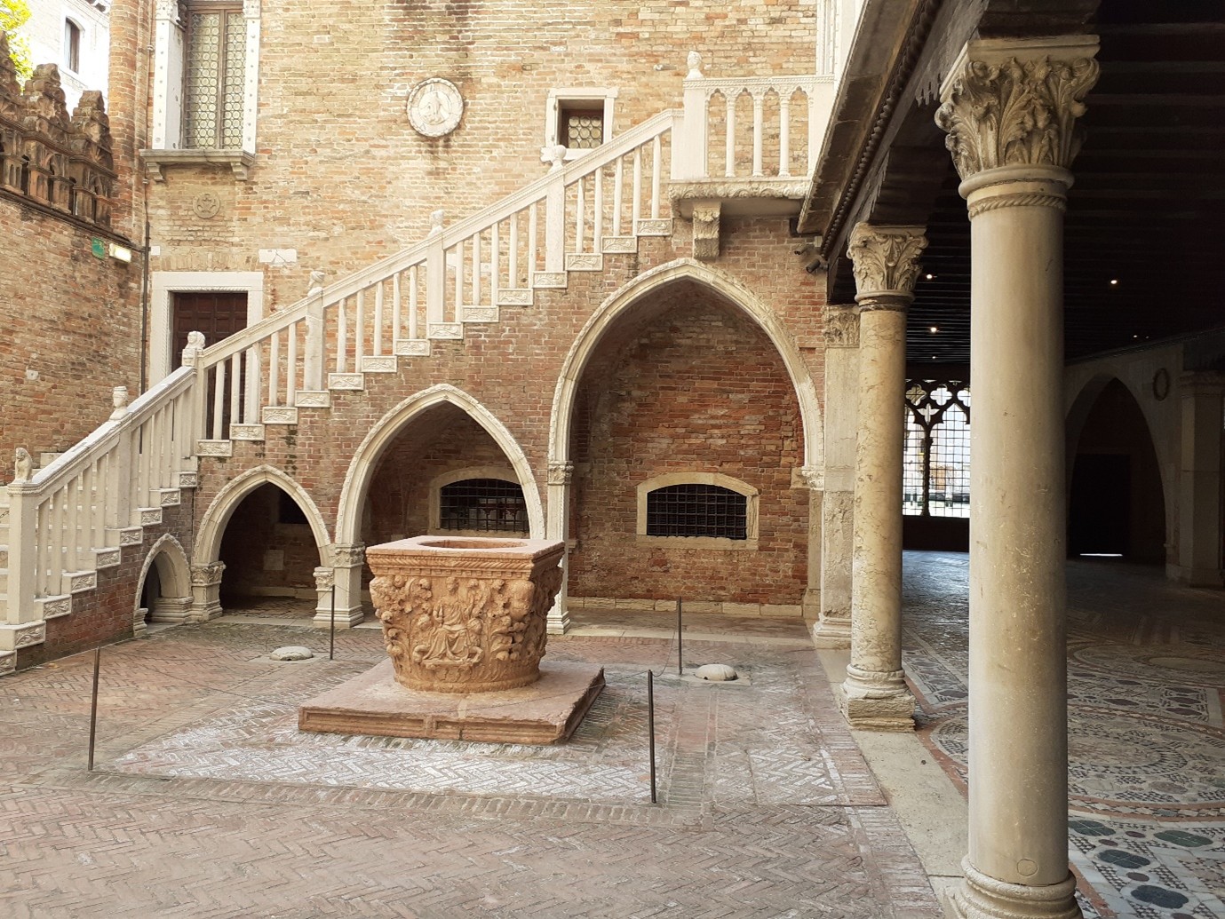 Puis on entre dans le hall, le Portico, qui donne sur le Grand Canal. A gauche, se trouve une autre petite cour, avec là aussi une très belle margelle de puits…