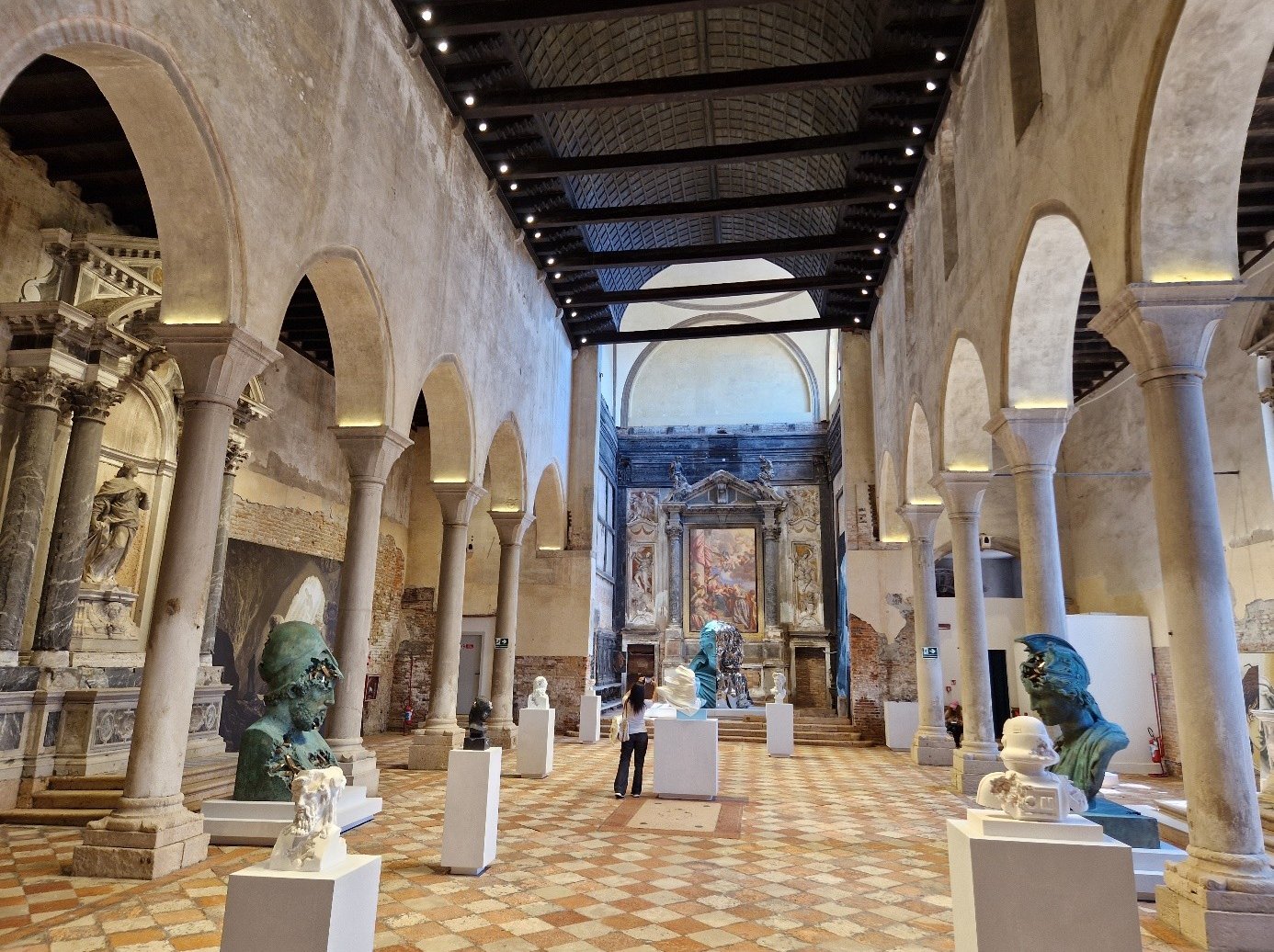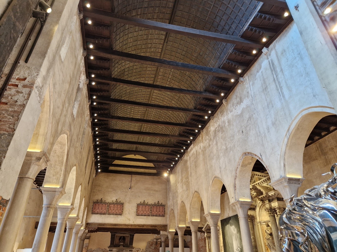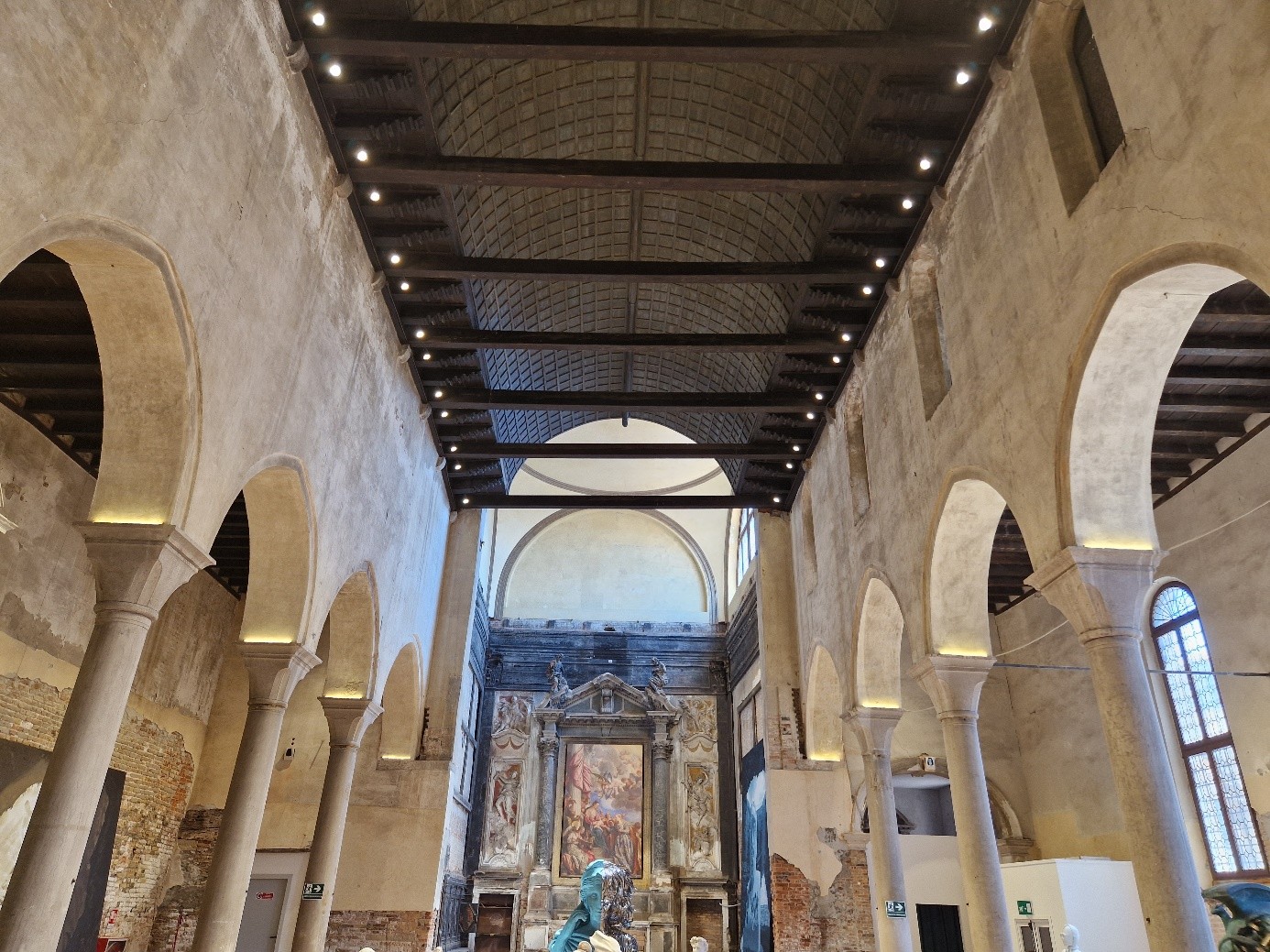 C'est caractéristique du style gothique. On a déjà vu ce type de plafond dans l'église San Giacomo dell'Orio et on le retrouvera dans l'église Santo Stefano. Ce plafond date du XIVème siècle mais l'église fut fondée un siècle plus tôt... Elle est aujourd'hui déconsacrée mais est ouverte à l'occasion d'expositions, comme aujourd'hui... Au fond, le retable au-dessus de l'autel est une copie du Sposalizio de Santa Caterina de Véronese, dont l'original se trouve aux Galeries de l'Académie...