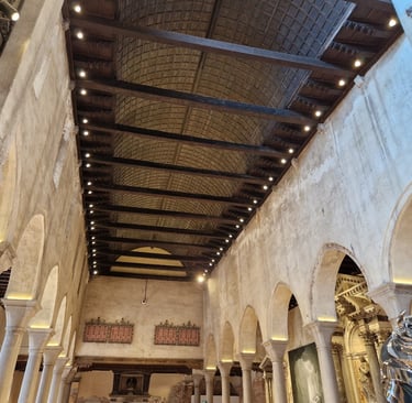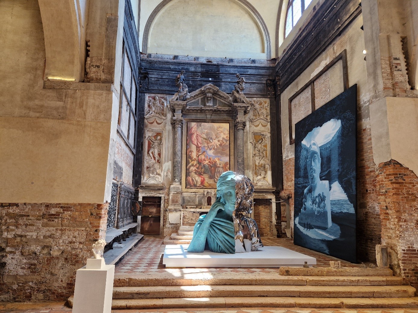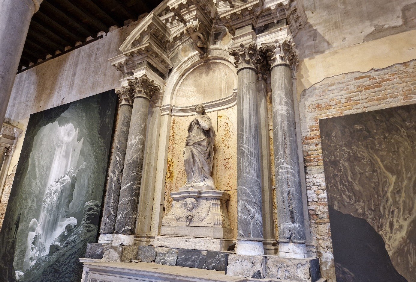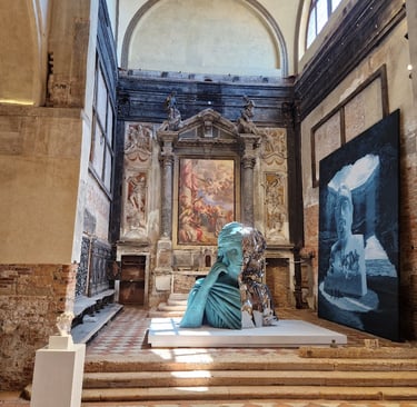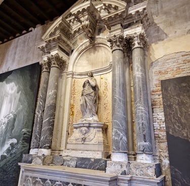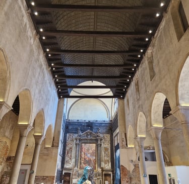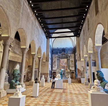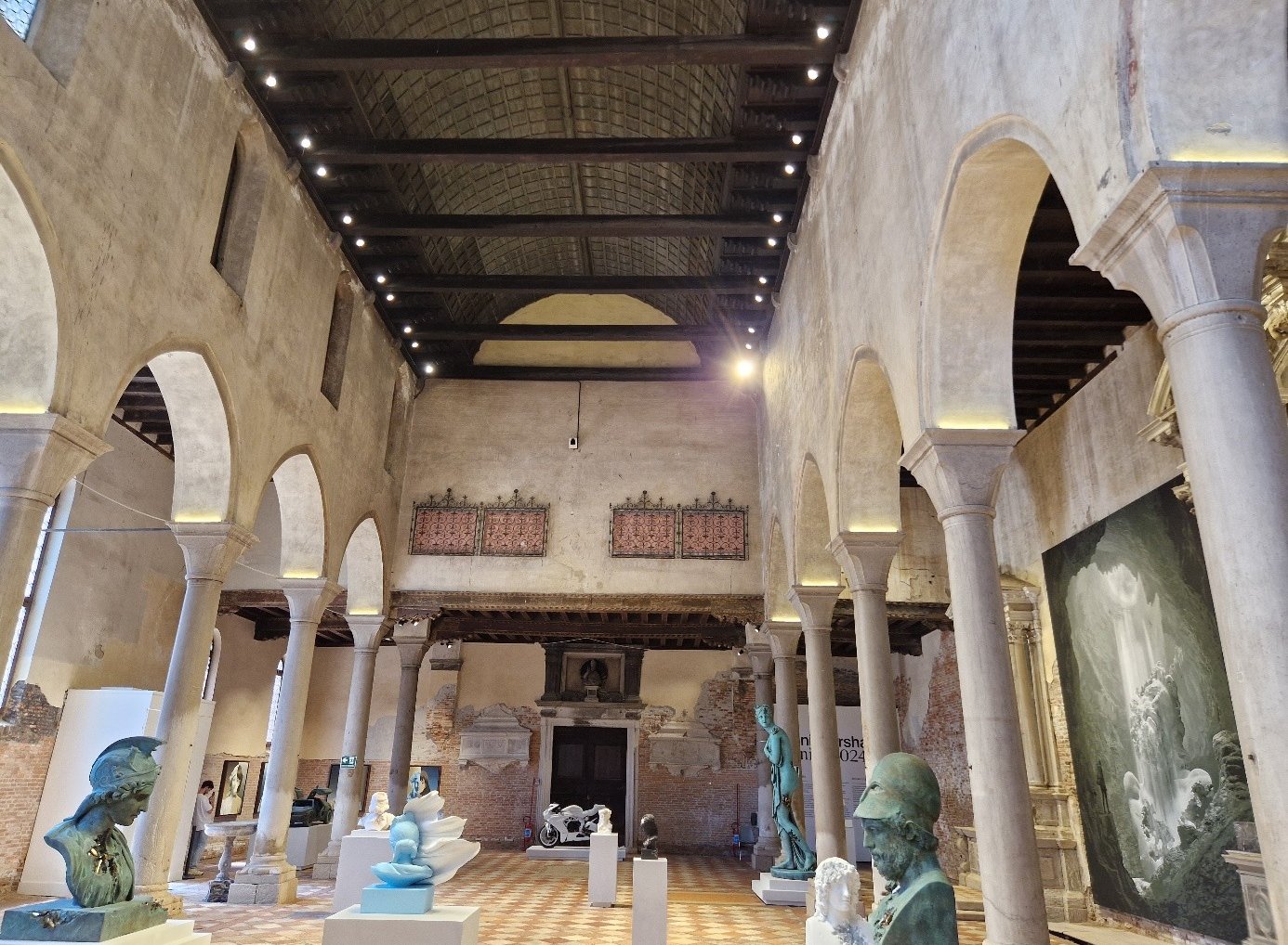 C'est caractéristique du style gothique. On a déjà vu ce type de plafond dans l'église San Giacomo dell'Orio et on le retrouvera dans l'église Santo Stefano. Ce plafond date du XIVème siècle mais l'église fut fondée un siècle plus tôt... Elle est aujourd'hui déconsacrée mais est ouverte à l'occasion d'expositions, comme aujourd'hui... Au fond, le retable au-dessus de l'autel est une copie du Sposalizio de Santa Caterina de Véronese, dont l'original se trouve aux Galeries de l'Académie...