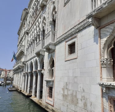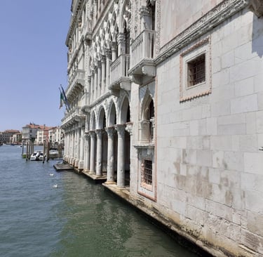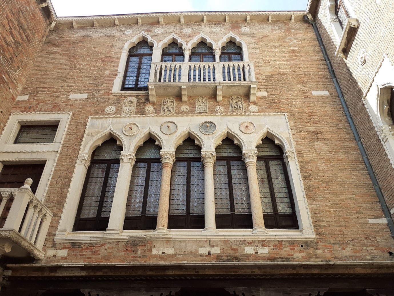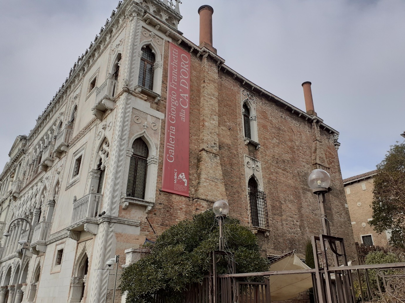 Car sa façade comportait beaucoup de dorures ; il y en a moins aujourd’hui mais sa façade en marbre blanc reste une des plus belles du Grand Canal… Elle fut construite après le reste du palais, à partir de 1429. Les dentelures de pierre sont l’œuvre de Matteo Raverti, un maçon milanais qui fit son apprentissage sur le chantier du Duomo de Milan. En revanche, les ornements d’architecture sont de deux vénitiens. Giovanni Bon et son fils Bartolomeo. Le maître d’œuvre du palais fut Marino Contarini, qui acheta le terrain en 1412. C’est en 1440 que le palais fut achevé. Mail il ne conserva pas longtemps sa splendeur originelle ; au fil des changements de propriétaires, son état se détériora. Le baron Giorgio Franchetti le rachète à la fin du XIXème siècle et le fait restaurer. En 1916, il fait don de son palais et de ses collections à l’Etat. Un musée est ouvert en 1927, qui prend le nom du dernier propriétaire privé : la Galleria Giorgio Franchetti….
