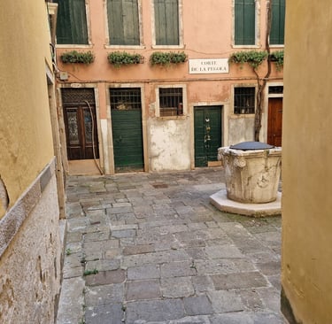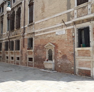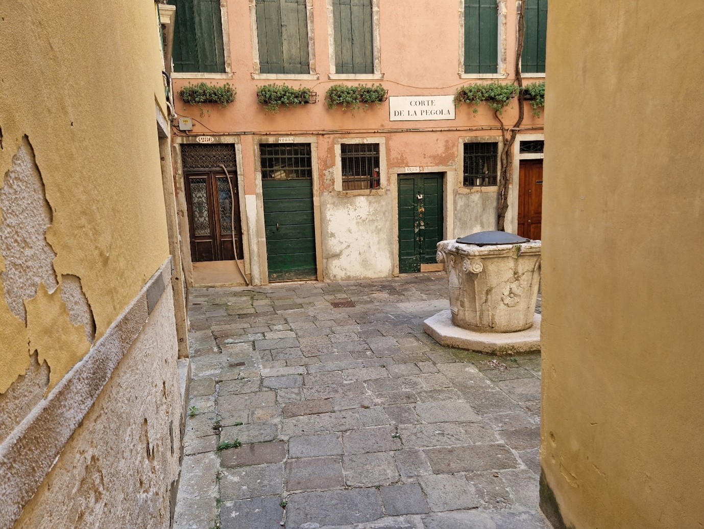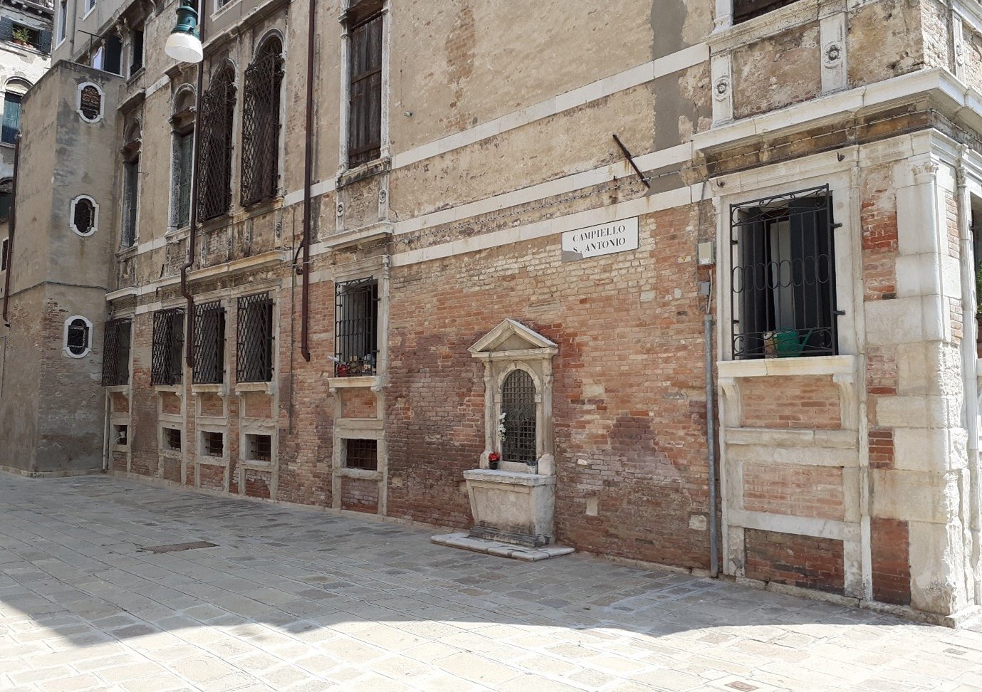 Oui, on y va tout de suite… On traverse le campiello Sant’Antonio… On prend à droite pour arriver dans la corte de le candele, qui s’appelle ainsi car il y avait au XVIème siècle une fabrique de bougies…