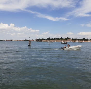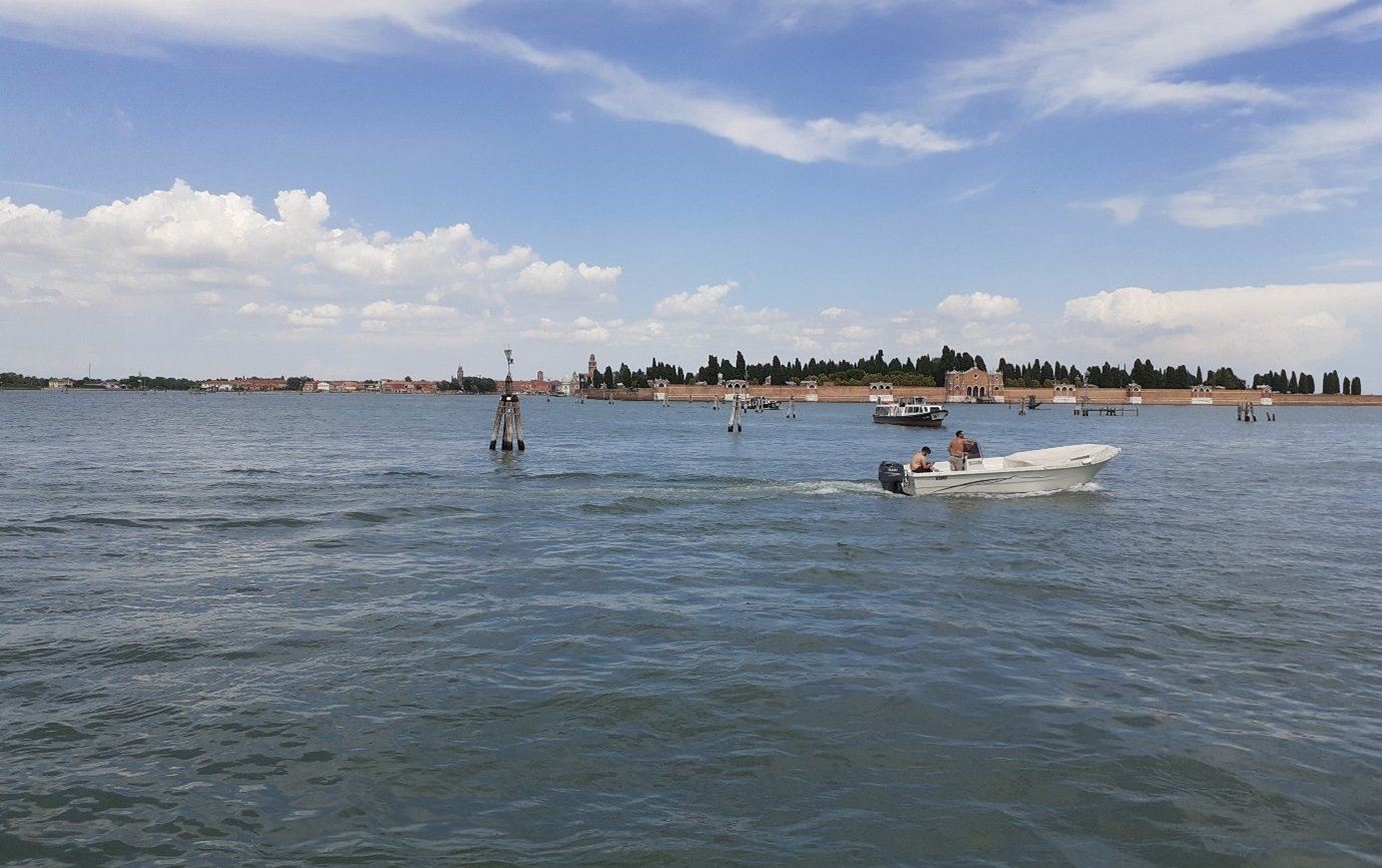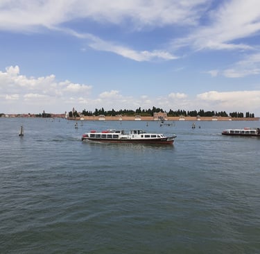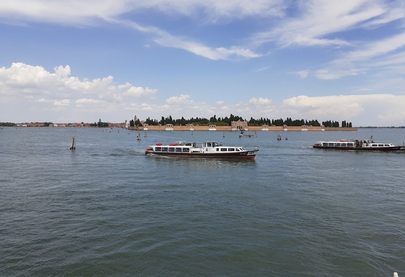 C'est l'île de San Michele, qui abrite le cimetière de Venise... Un peu plus loin, on aperçoit l'île de Murano.