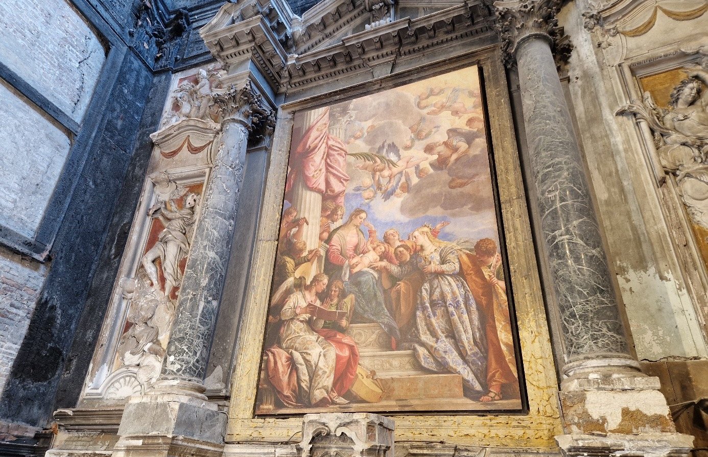 Ce retable n'est pas de Palma Le Jeune. Il date du XIXème siècle. Il a remplacé L'Adoration des Mages de Paris Bordone, qui lui-même avait remplacé L'Adoration des Mages de Palma Le Jeune, qui a été retiré de cet emplacement avant de disparaître au début du XIXème siècle.