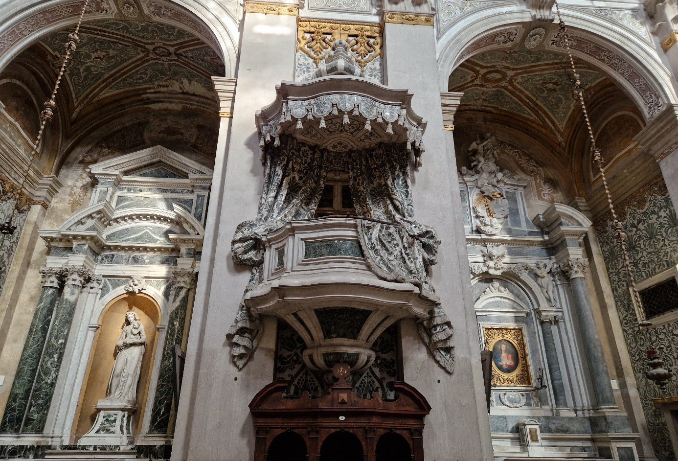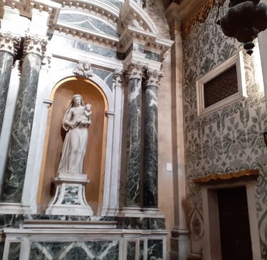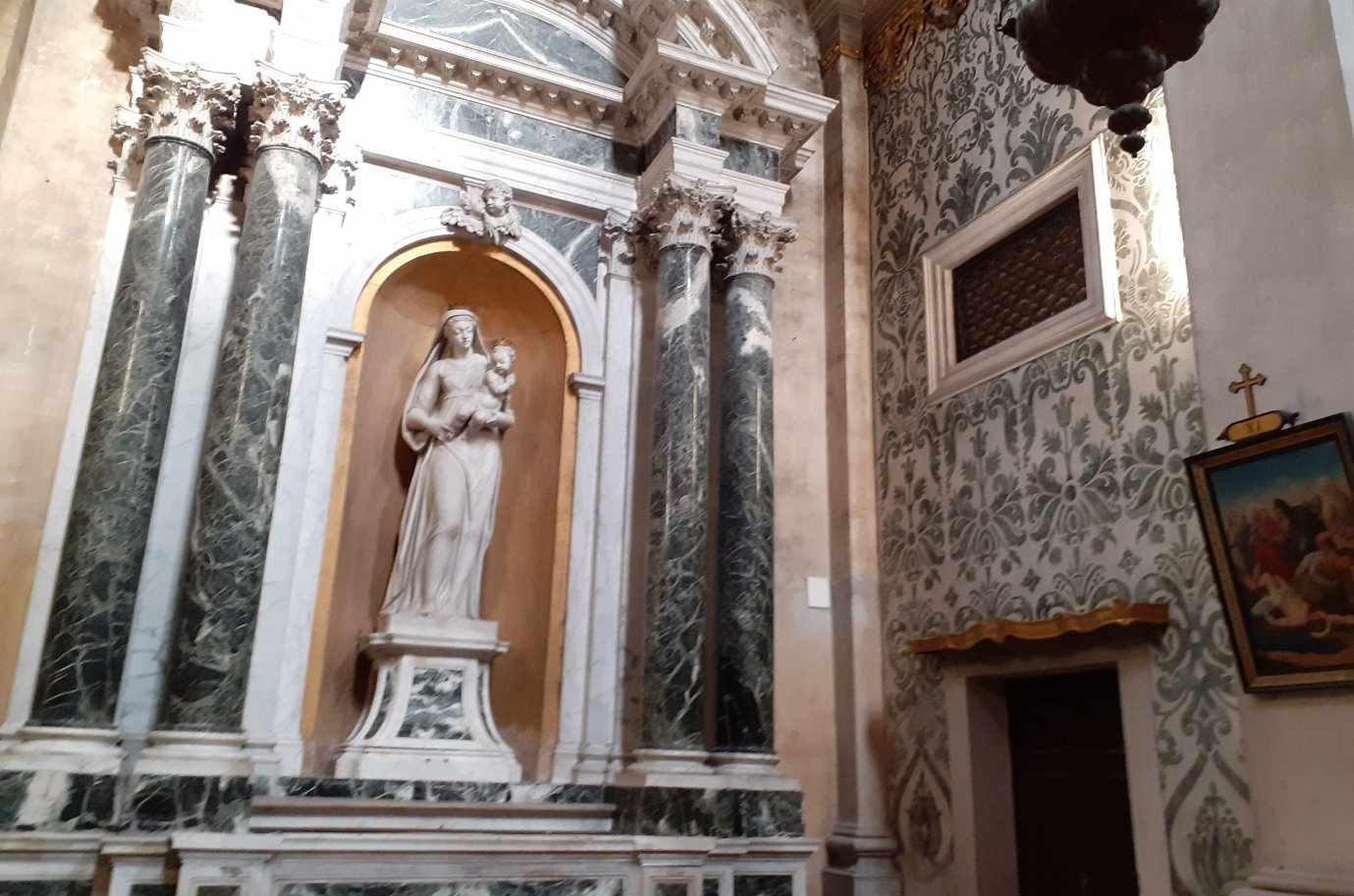 A droite, c'est Le Sacré Cœur de Jésus, réalisé par Alessandro Revera au XIXème siècle... Et à gauche, c'est la chapelle de la Vierge, avec cette statue datant de l'ancienne église des Crociferi, réalisée par Andrea dell'Acquila...