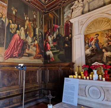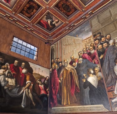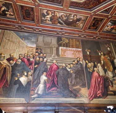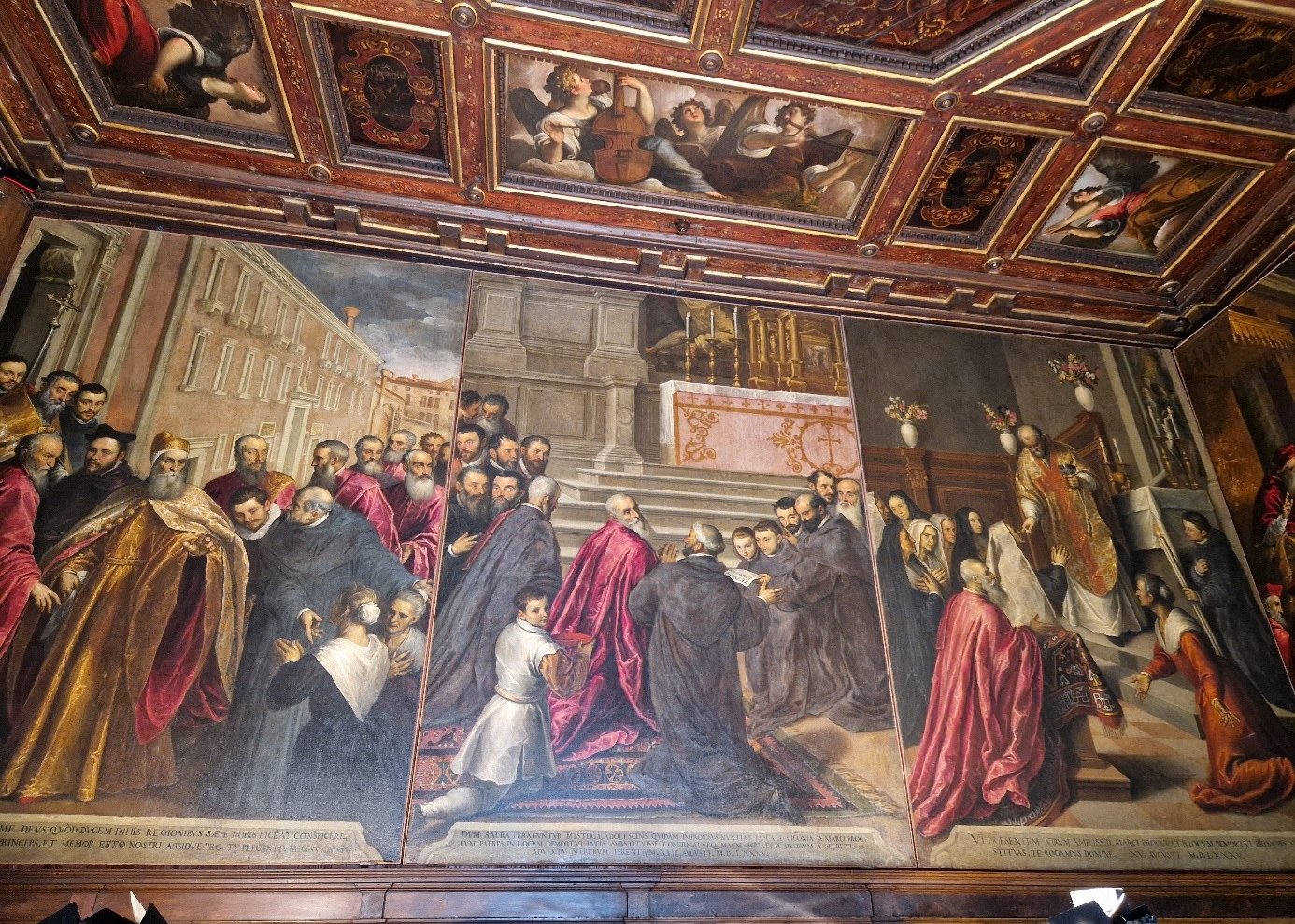 A gauche, c'est : Pasquale Cicogna assiste à la messe célébrée dans l'oratoire des Crucifères par le père Priamo Balbi, réalisé en 1589-1590... Pasquale Cicogna, alors qu'il était le doge de Venise, a commandé ce cycle de Palma Le Jeune. Sur la droite, juste à côté, c'est le pape Paul IV qui remet un bref à l'ambassadeur vénitien... Sur la gauche, on retrouve Pasquale Cicogna devant l'autel de l'église, assistant aux louanges chantées par les Pères Crucifères...
