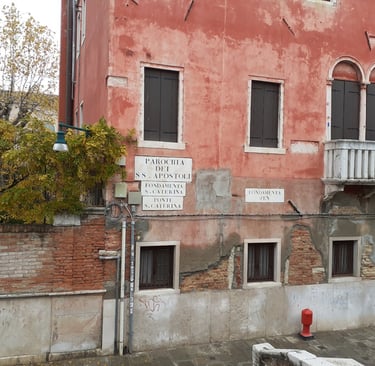 Aujourd’hui, on va visiter mon église préférée : les Gesuiti ! Et on va se promener pour la première fois sur le quai septentrional de Venise : les fondamente Nuove. On va prendre le rio di Noale sur la droite… On arrive sur le canal della Misericordia…et tout de suite à droite, le rio di Santa Caterina…On passe sous le ponte Molin… puis sous le ponte Santa Caterina… On va s’arrêter sur le campiello Sant’Antonio…