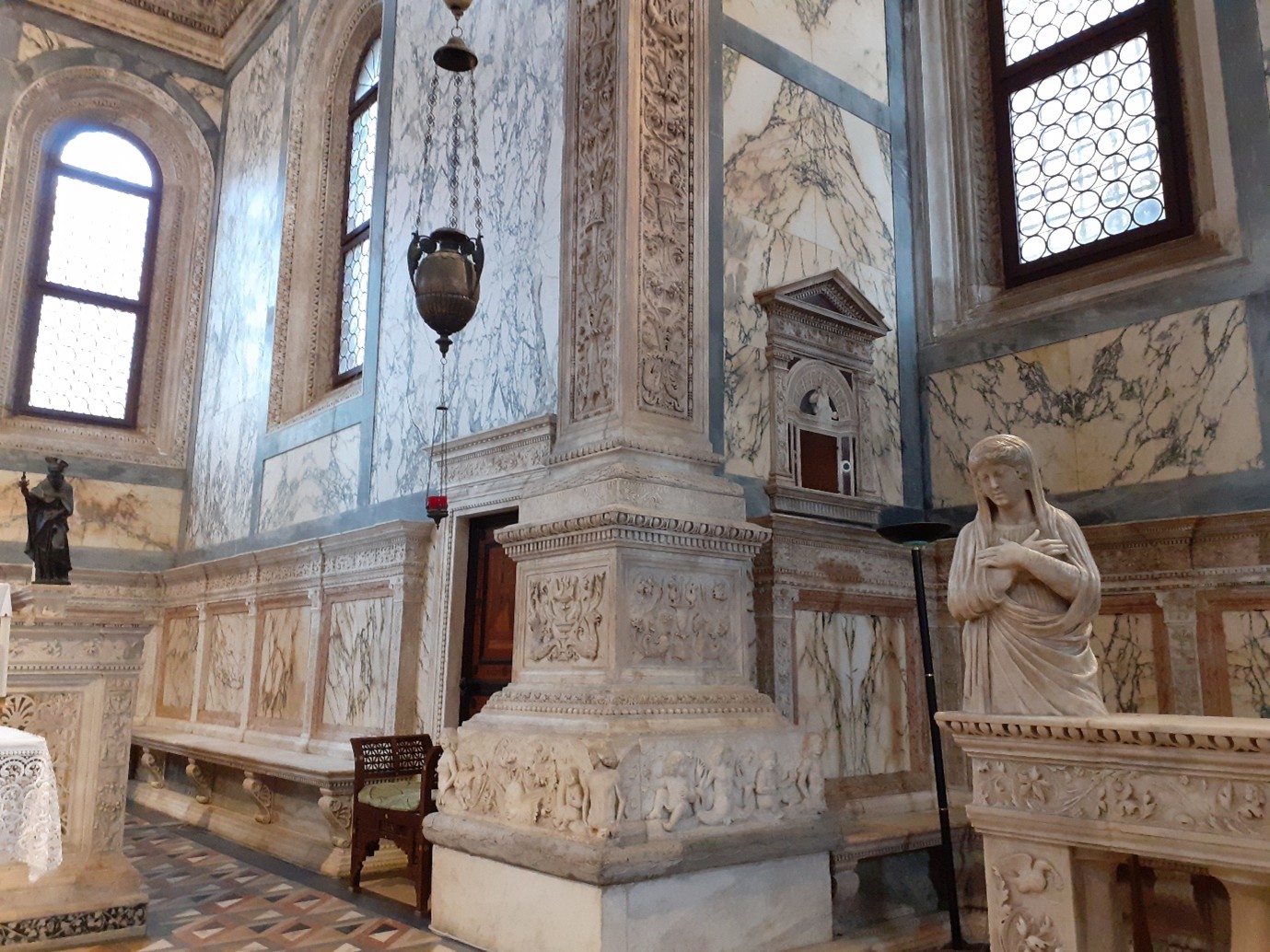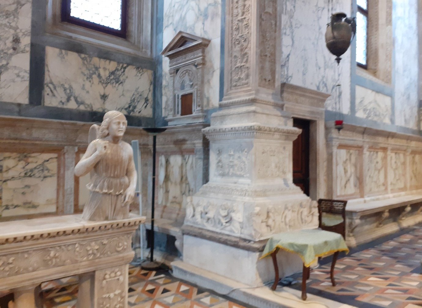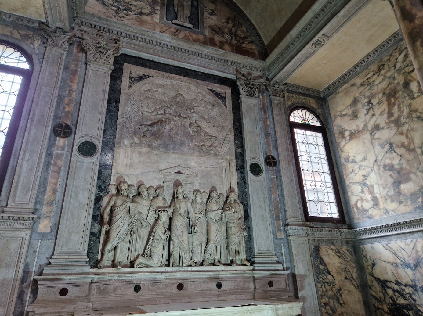 Dans la chapelle sur le côté gauche, on peut admirer un magnifique groupe sculptural, de Tullio Lombardo : L'Incoronazione della Vergine fra gli Apostoli, réalisé en 1501-1502...