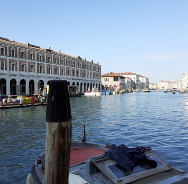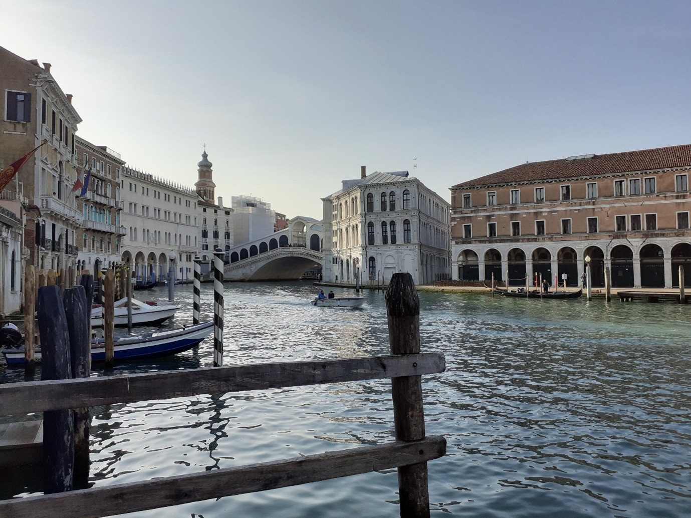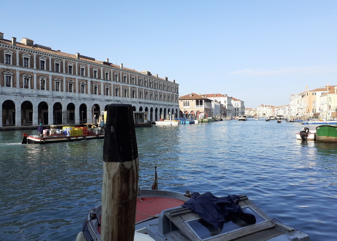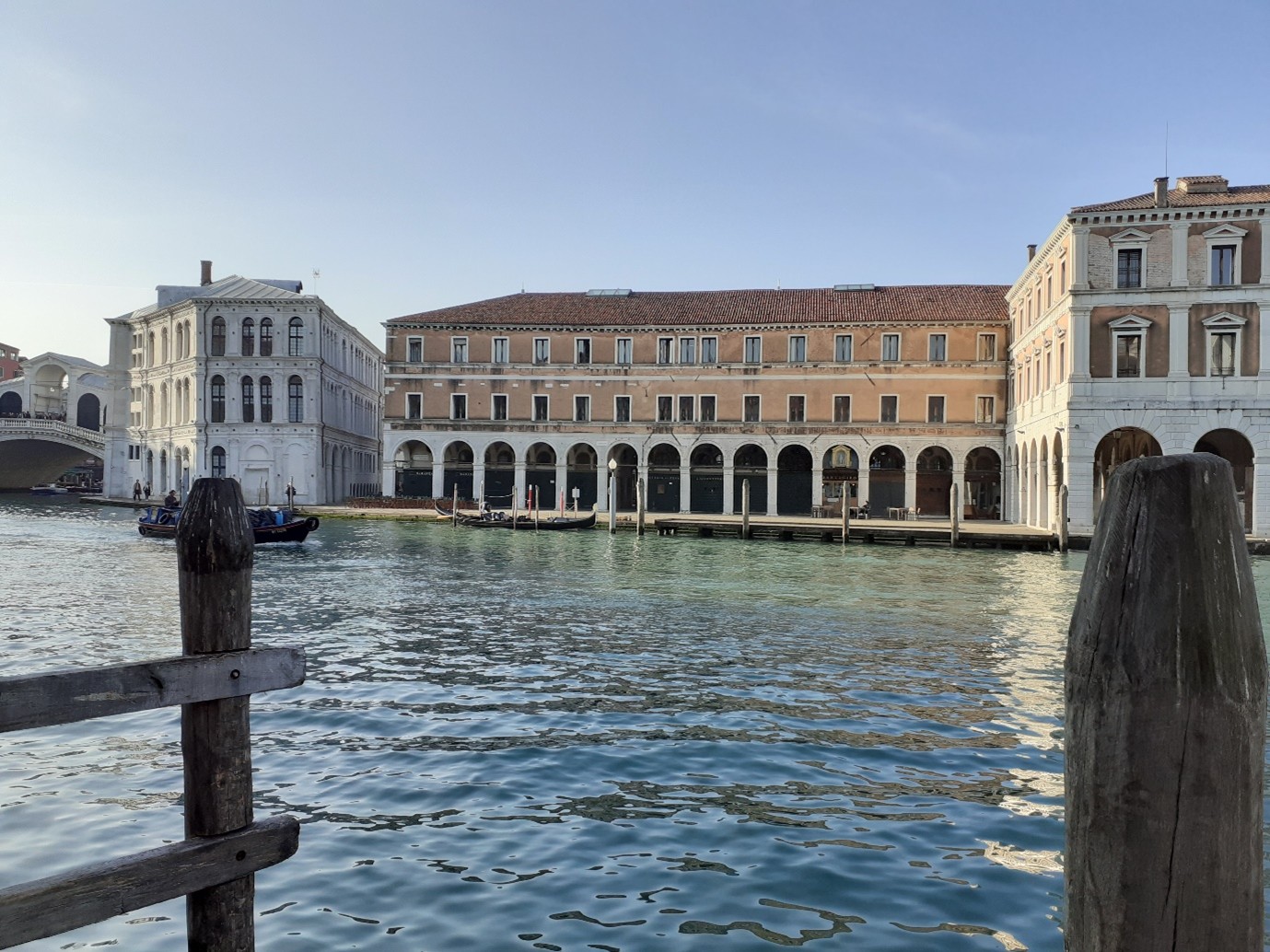 La vue sur le Grand Canal est magnifique. Sur la gauche, on voit le pont du Rialto et le palais Camerlenghi...