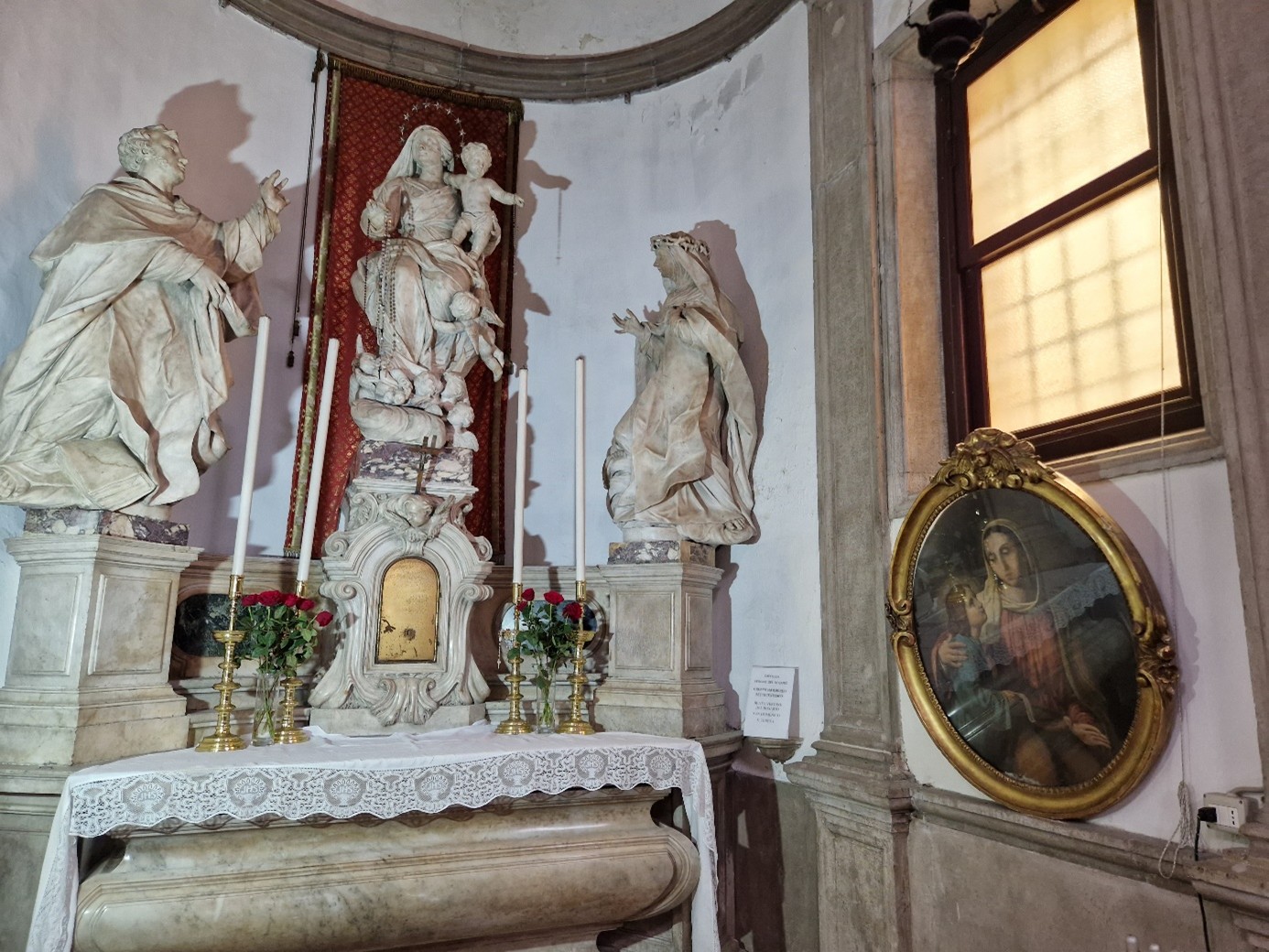 Dans la chapelle à droite, on peut admirer un groupe sculpté de La Vergine del Rosario fra San Domenico e Santa Teresa, qui date du XVIIième siècle...