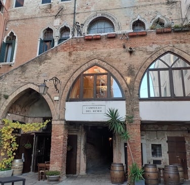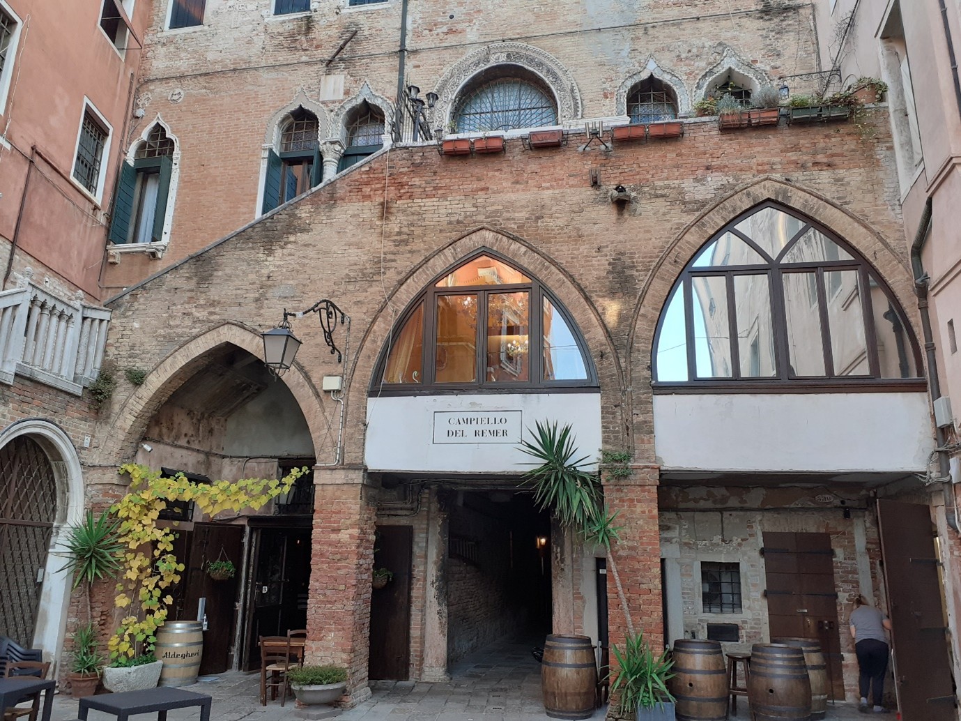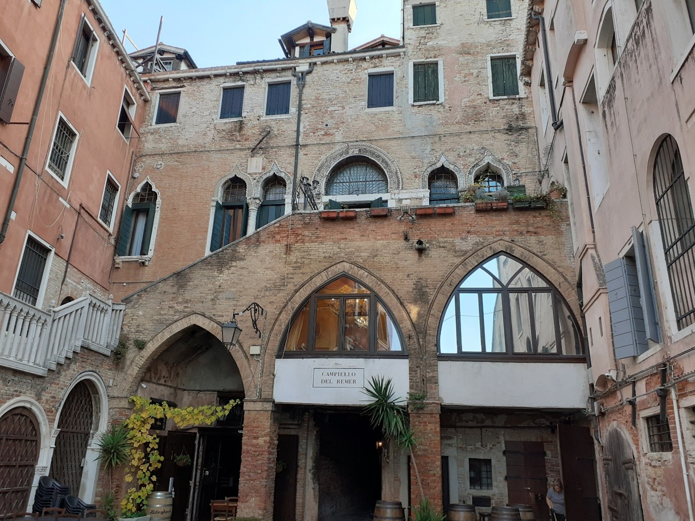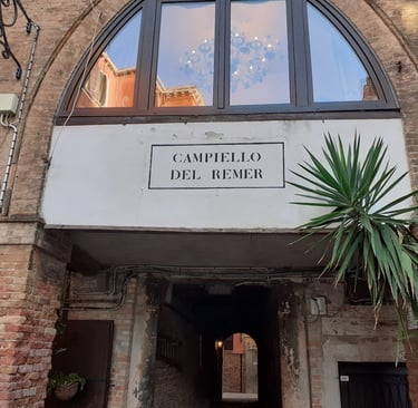 On prend en face, un peu sur la droite par rapport à la calle Modena, la calle del Scaleter o de la Stua… On arrive dans la corte del Remer… On passe sous ce sottoportego… Et nous voilà sur le campiello del Remer !