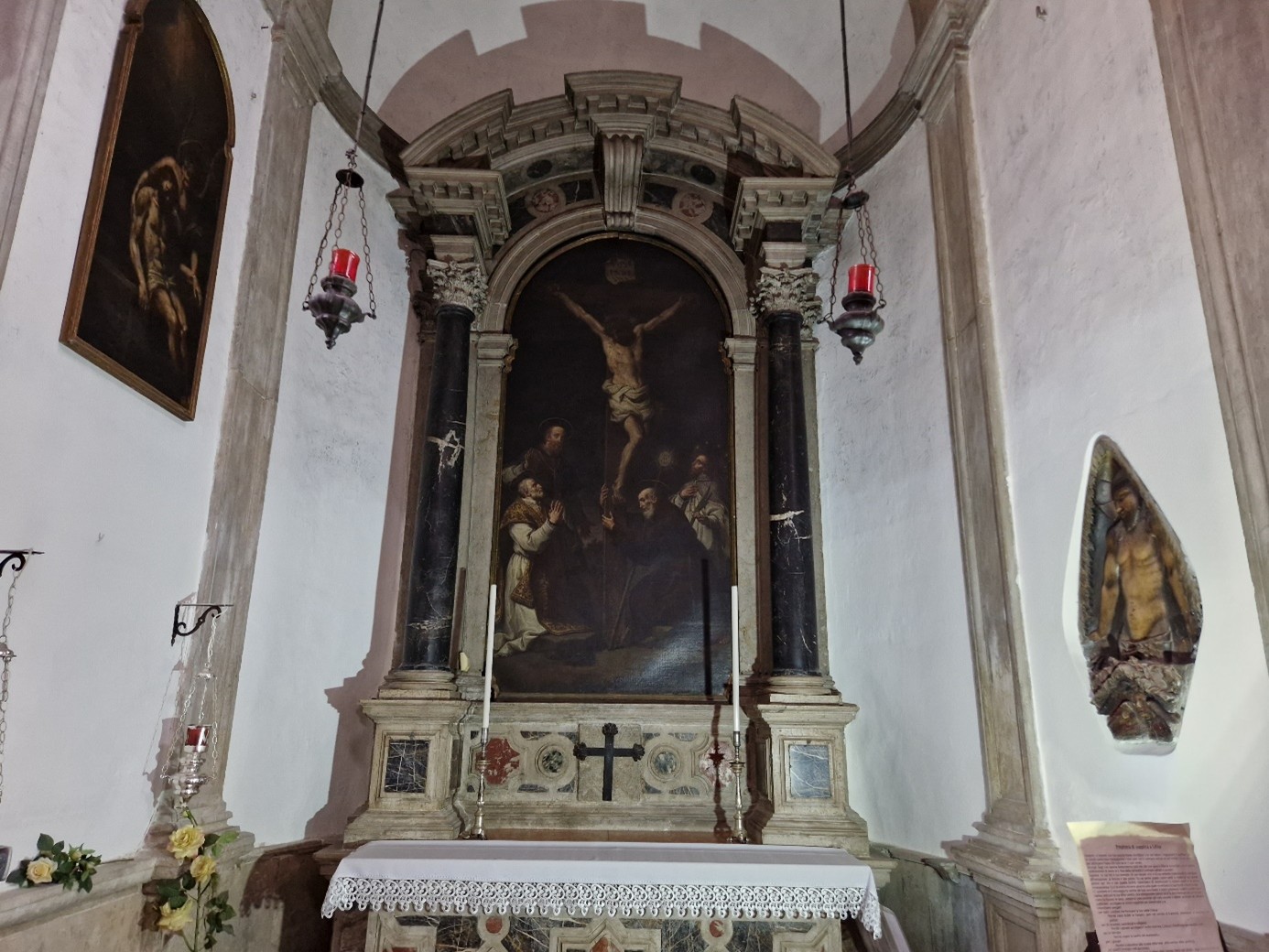 Du côté gauche de l'autel principal, il y a ce retable de Bartolomeo Letterini : Crocifissione con San Francesco di Paola e santi...