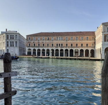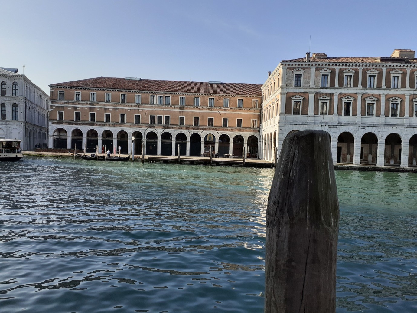 On voit aussi sur la gauche, mais sur notre rive, le Fontego dei Tedeschi, juste avant le pont du Rialto ainsi que le campanile de l'église San Bartolomeo, qui se trouvent dans l'îlot que l'on visitera demain...