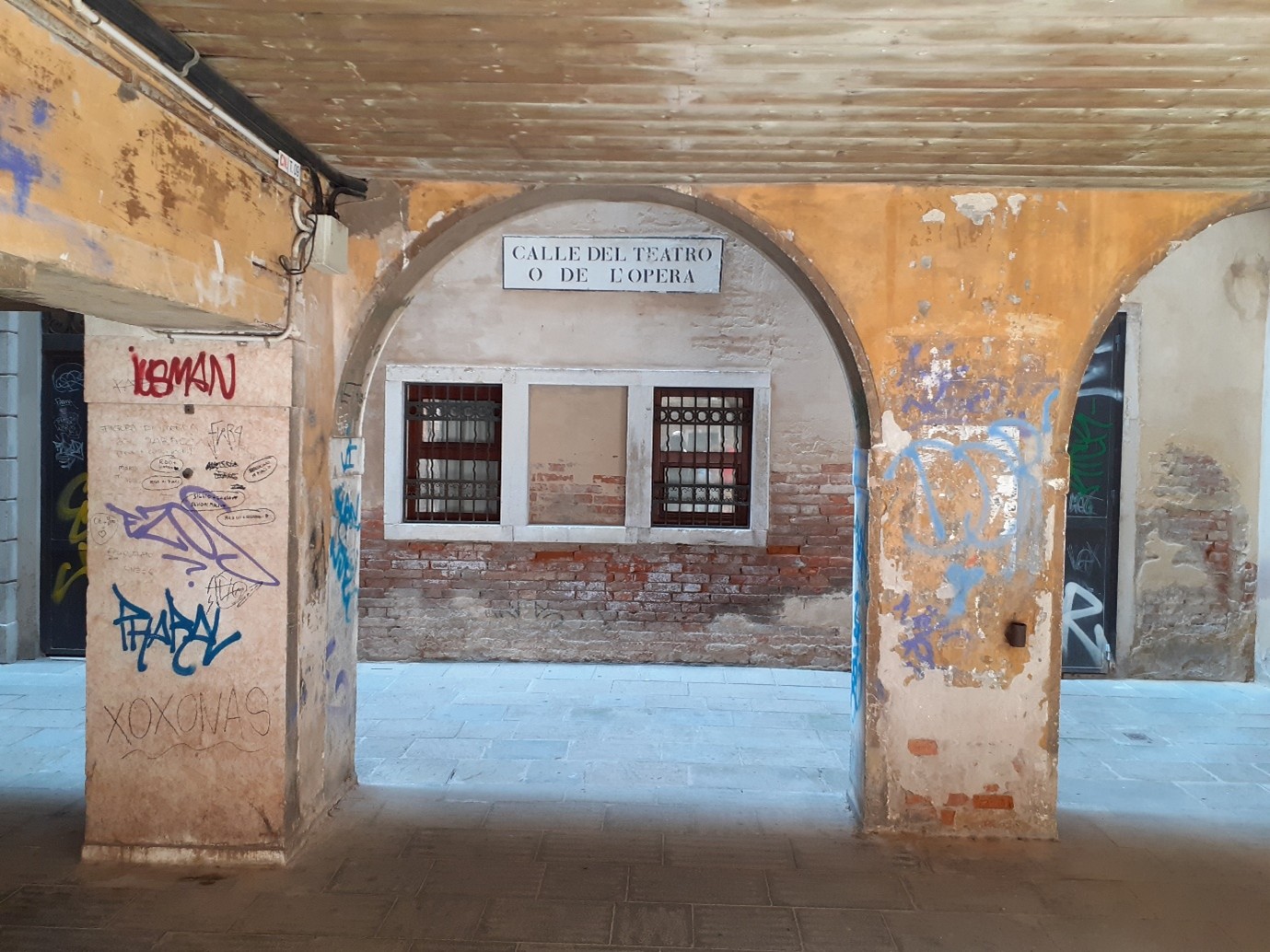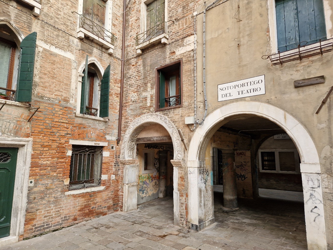 Ici se trouve le Théâtre Malibran. Il s’appelait Teatro San Giovanni Crisostomo lorsqu’il fut fondé en 1677 par la famille Grimani. Goldoni y donna des représentations ; dans ses Mémoires, il évoque ce théâtre comme étant le plus important de Venise dans les années 1720. Il cite les six autres de son époque : San Cassian, qui se trouvait dans l’îlot entre celui de San Cassiano et celui de Santa Maria Mater Domini, là où on a fait des courses au magasin bio ; San Luca, où on sera après-demain ; San Beneto et Sant’Angelo où on sera dans trois jours ; San Moise et San Samuele, où l’on sera un peu plus tard…