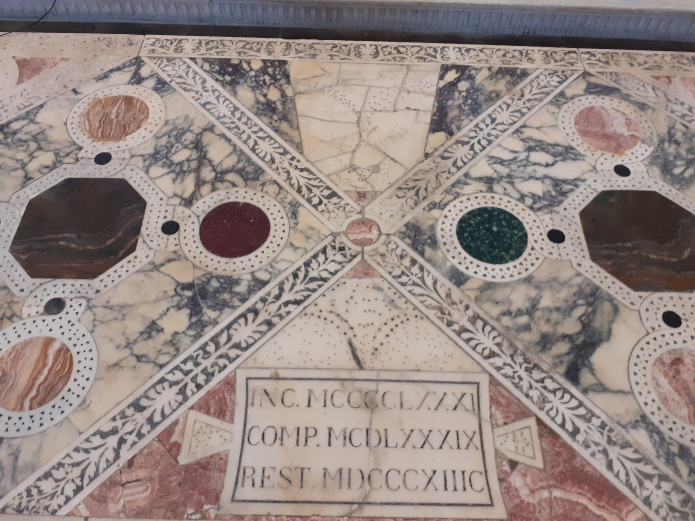 On peut lire, en latin, les dates de début et de fin de la construction de l'église : 1481 et 1489, ainsi que celle de la dernière restauration : 1887...