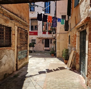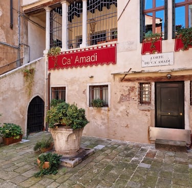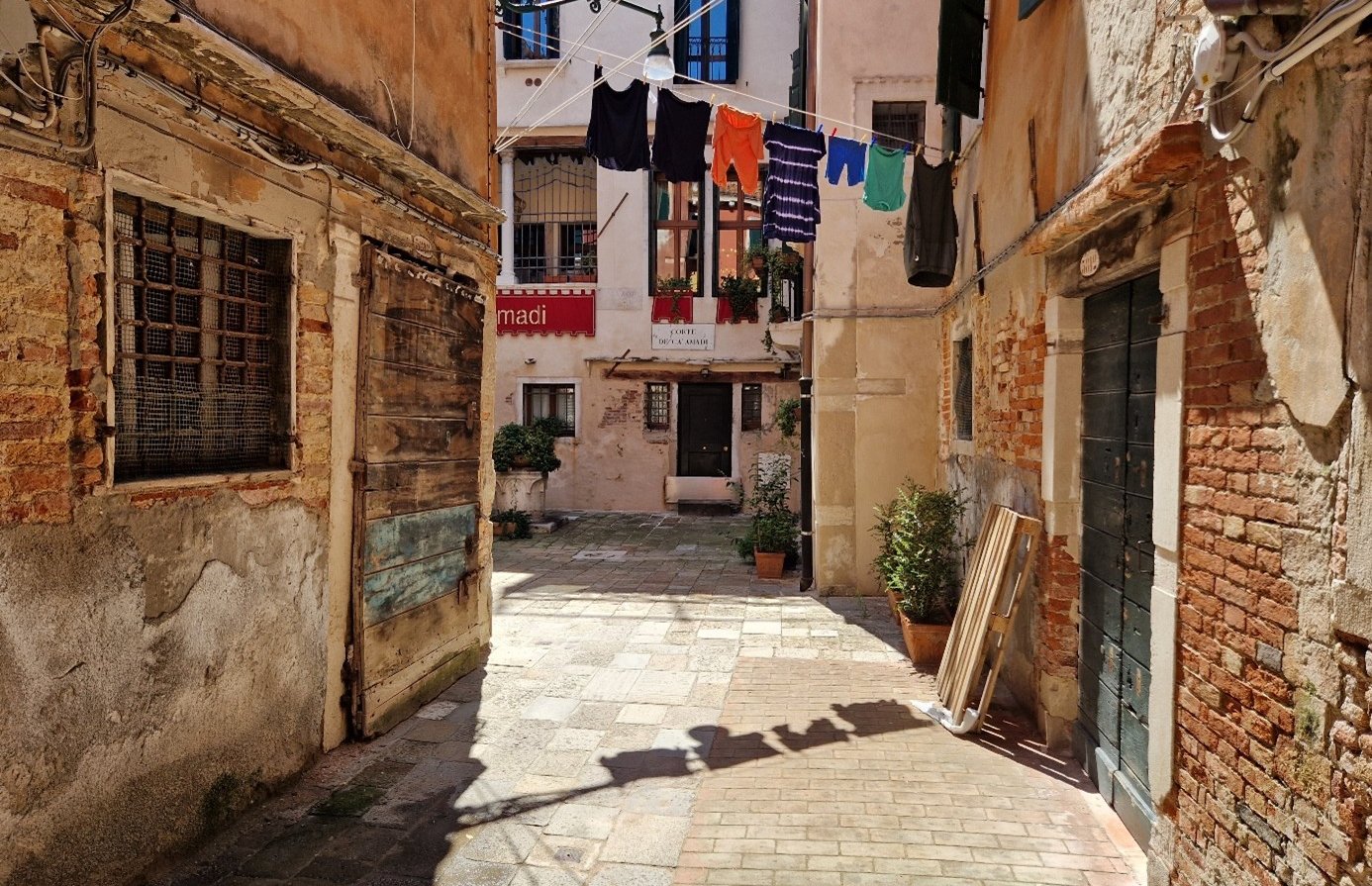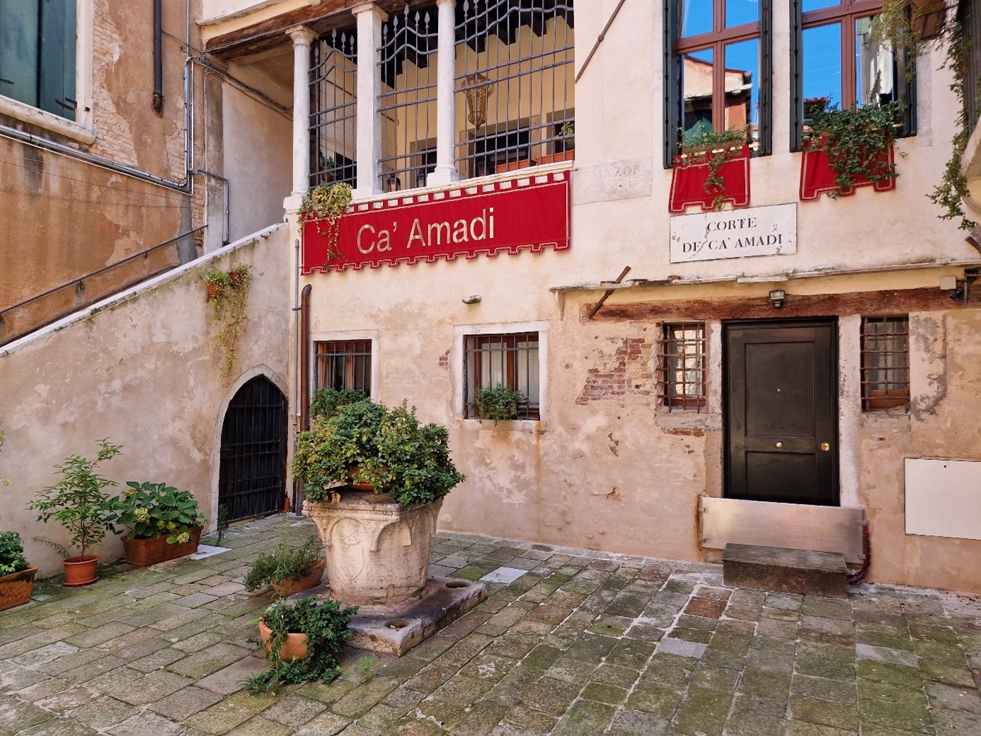 On va prendre cette fois à gauche la calle del Cagnoletto puis à gauche la calle Morosini qui va nous permettre d’accéder à deux autres cours : la corte Amadi et la corte Morosina…