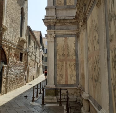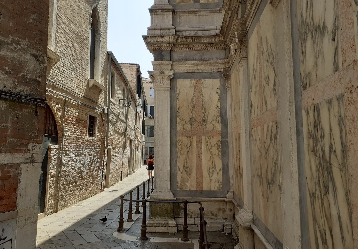 On va voir la cour où est né Marco Polo… On prend la calle de l’Uffizio de la seta, sur le côté droit de l’église…. On passe sous ce portique… et on se retrouve dans la corte prima del Milion…