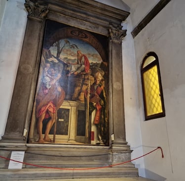 En continuant la visite sur le côté droit, on trouve une grande œuvre vénitienne : le retable de Giovanni Bellini, réalisé en 1513 : San Girolamo, San Cristoforo e Sant'Agostino...
