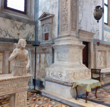 Et derrière, toujours sur la balustrade, on a la stuette de l'Archange Gabriel à gauche et de l'Ange annonciateur (ou annonciatrice) à droite, également réalisées par Tullio Lombardo...