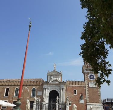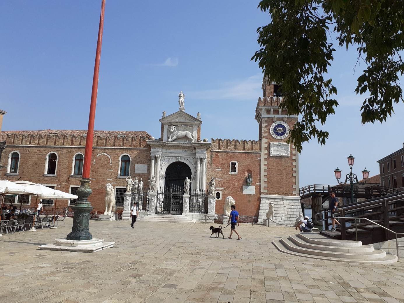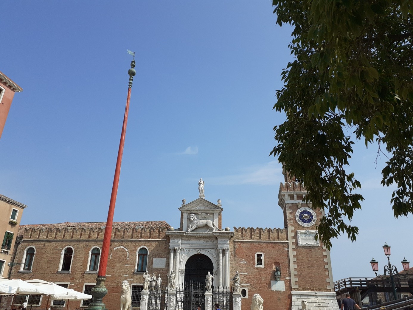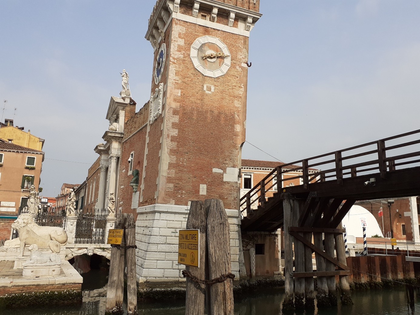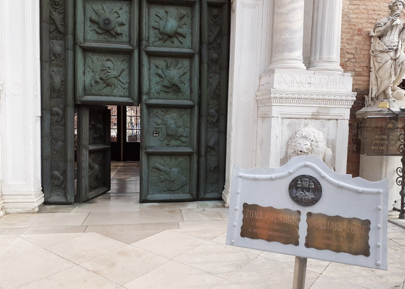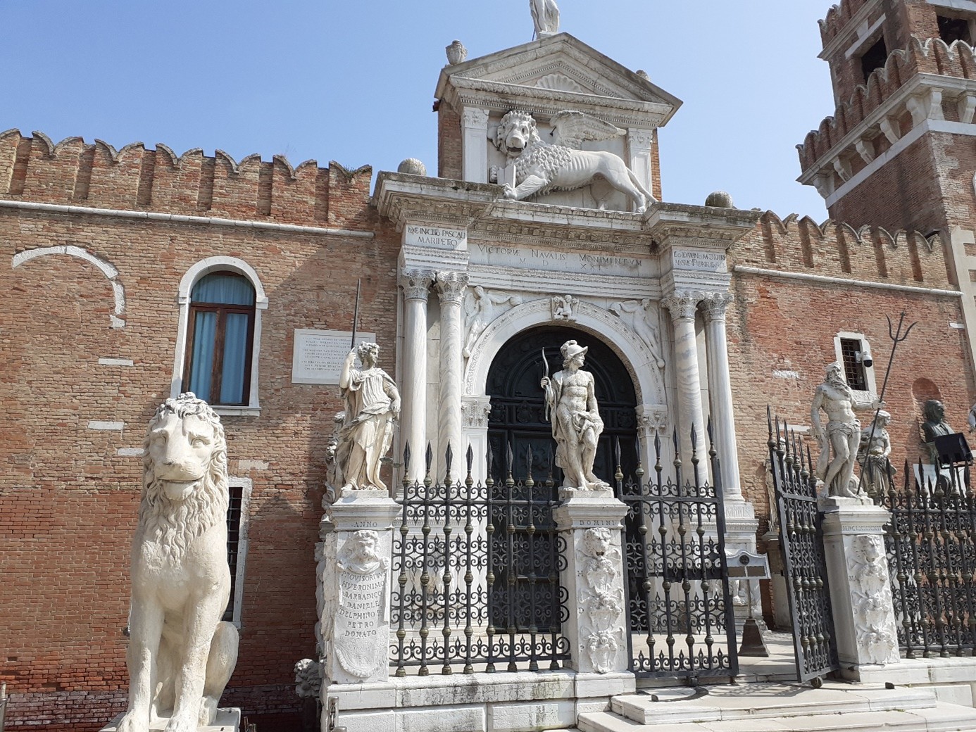 Oui, celles à l’extrême droite et à l’extrême gauche ont été rapportées d’Athènes lors de la reconquête de la Morée, dans le Pélopponèse en 1687. C’est aussi à ce moment-là que furent érigées les statues de Neptune, de Mars et de la Justice, de droite à gauche. Regarde à droite du portail ! C’est un buste de Dante Alighieri, qui visita l’Arsenal en août 1321. Il était alors ambassadeur de Guido Novello da Polenta, seigneur de Ravenne….