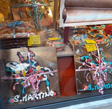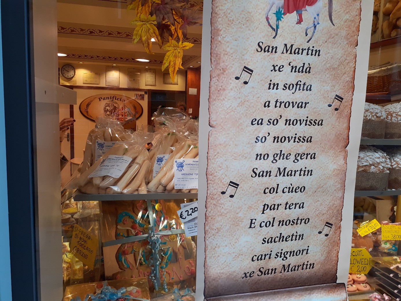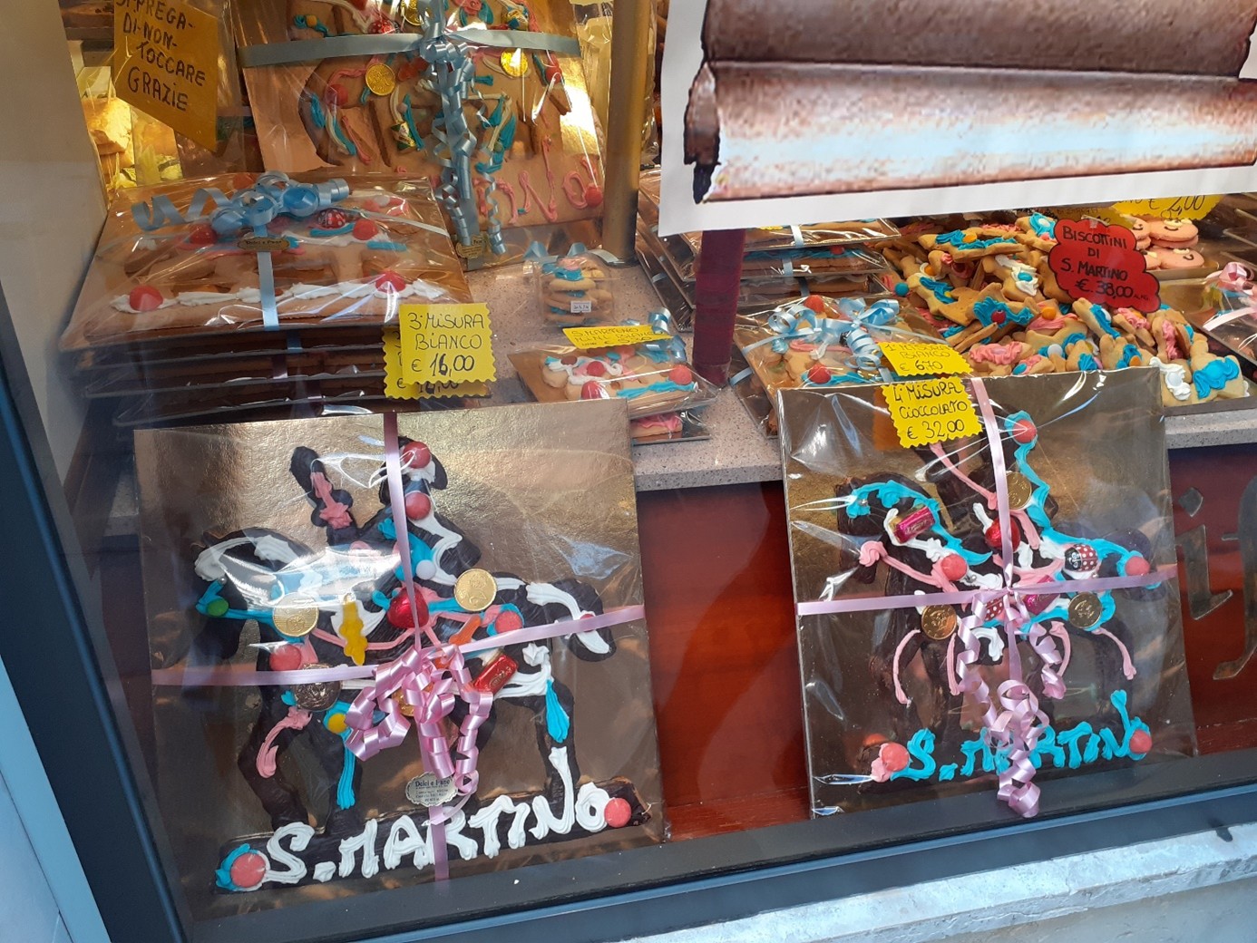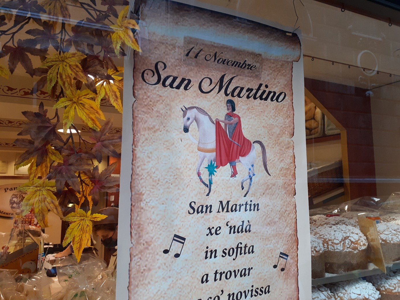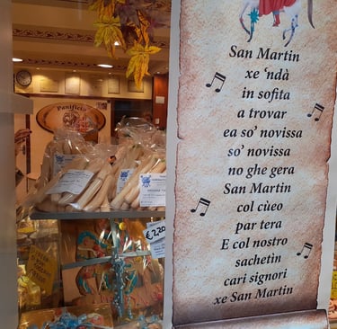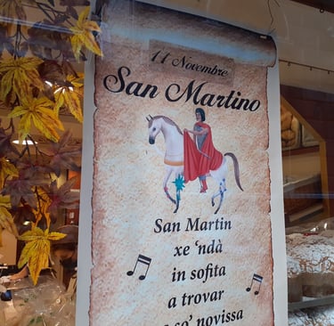 San Martino, qu'on devrait plutôt appeler Saint Martin car il fut évêque de Tours, est généralement représenté à cheval. En effet, il était soldat de la garde impériale à cheval, lorsqu'il rencontra un pauvre grelottant et lui donna la moitié de son manteau, celle qui lui appartenait, l'autre moitié appartenant à l'Empire romain. La nuit suivante, il vit le Christ vêtu de la moitié du manteau qu'il avait donné. Par la suite, alors qu'en plein automne, il voyageait sur son cheval, les arbres et les fleurs refleurirent à son passage. C'est l'origine de ce que l'on appelle l'été de la Saint Martin, lorsqu'il fait un temps estival en automne. Surtout le 11 novembre, jour de la Saint Martin, une fête très populaire à Venise. Ce jour là, les enfants se promènent dans les ruelles en tapant sur des couvercles et des casseroles avec de grandes cuillers en bois pour obtenir une petite pièce. Ils ne font pas que du bruit, ils chantent aussi parfois une comptine vénitienne en l’honneur de Saint Martin, surtout lorsqu’ils entrent dans les bars ou les boutiques. Autrefois, la Saint Martin à Venise était le jour du renouvellement des contrats de location, d’où l’expression « far Samartin, faire Saint Martin, c’est-à-dire déménager...