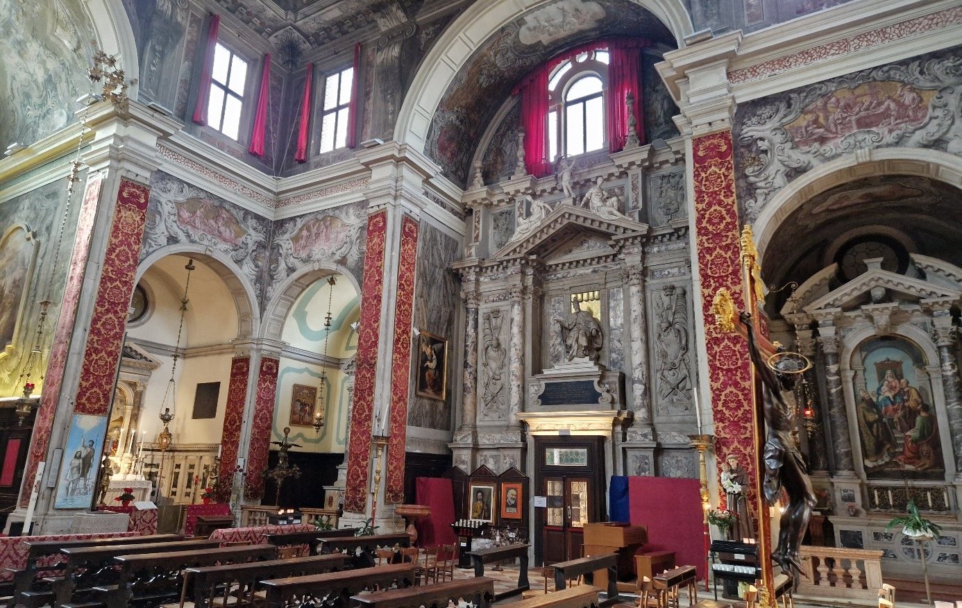 Oui ; on avait vu la calle où il a vécu, la calle Pometti… La façade a été refaite en 1897 par Domenico Rupelo, qui a quand même conservé le portail de Sansovino. Le reste de l’église a été restauré en 1973…