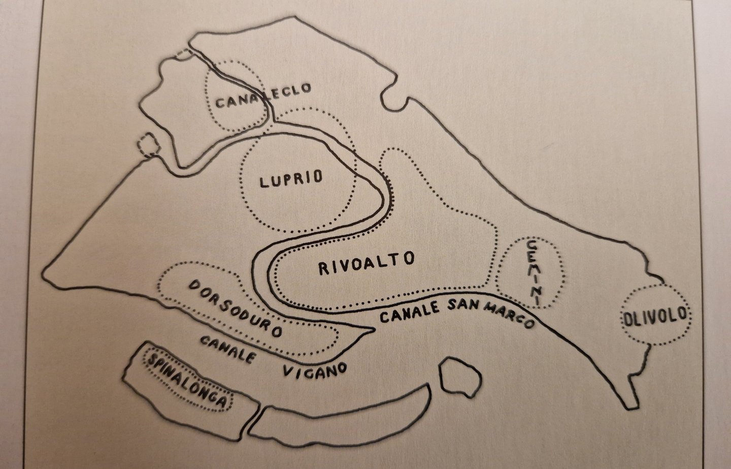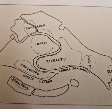 Cet îlot est un des deux îlots, que l'on appelait les Gemini, car ils étaient habités par des marins qui se vouaient au culte des jumeaux Dioscuri.... Dans la Venise originelle, celle de la fondation, entre le Vème et le IXème siècle, il y avait six archipels : celui d'Olivolo, englobant l'actuel San Pietro di Castello ; les Gemini ; Rivoalto qui correspond à pêu près à l'actuel sestiere de San Marco ; Luprio qui englobait San Giacomo dall'Orio et en face San Marcuola ; Canaleclo autour du canal de Cannaregio et Dorsoduro, qui correspond à peu près à l'actuel Dorsoduro mais un peu moins étendu à l'ouest...